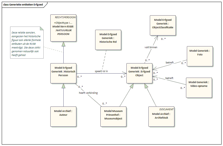 Generieke gegevensmodel Erfgoed In de volgende figuur 6 is de relatie van de objecttypen van het Prinsenhof te zien in relatie tot de generieke Erfgoed gegevensdefinities. Een ‘Museumobject’ is een ‘Erfgoedobject’ en op deze manier zijn foto’s en video’s gekoppeld aan het ‘Museumobject’. Ook is te zien hoe historische personen gekoppeld zijn aan erfgoedobjecten. Bovendien zijn historische personen afgeleid van het objecttype ‘Natuurlijk Persoon’, en krijgen zo attributen als naam, geboortedatum, sterfdatum en geslacht.