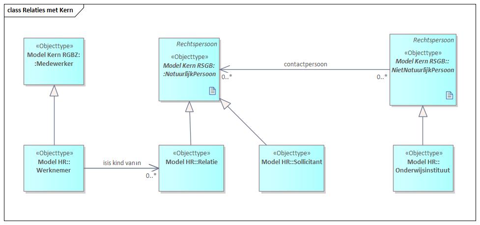 Het HR-model gebruikt niet direct personen, zoals gedefinieerd in de RSGB, alleen afgeleide entiteiten. In voorgaand figuur is te zien hoe het entiteit ‘Werknemer’ en de daaraan gekoppelde entiteit ‘Relatie’ zijn gedefinieerd.