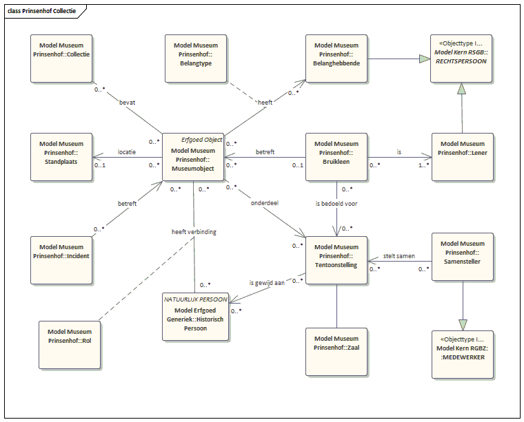 Binnen de ‘Collectie’ staan de objecten die bij het museum horen centraal. Deze zijn ‘Museumobject’ genoemd. Museumobjecten hebben een ‘Standplaats’ en kunnen in bruikleen zijn, in dit geval hebben zij een ‘Bruikleen’-object aan zich gekoppeld. In het geval van een bruikleen is er een ‘Lener’ aan gekoppeld. Dit kan zowel het Museum Prinsenhof zelf zijn (het is uitgeleend), als een externe lener (het wordt geleend van). Leners zijn een ‘Rechtspersoon’: een natuurlijk persoon of een niet-natuurlijk persoon. Daarnaast kunnen museumobjecten een ‘Belanghebbende’ hebben. In dit geval heeft deze belanghebbende altijd een bepaalde rol tov het museumobject. Naast de collectie worden de tentoonstellingen geadministreerd, met daaraan gekoppeld de gebruikte zalen en de samenstellers van de tentoonstelling. Bij de tentoonstellingen wordt bijgehouden welke museumobjecten onderdeel uitmaken van de tentoonstelling. Ook worden historische personen geadministreerd, en hun relatie tot museumobjecten via de Rol. Daarnaast worden incidenten geadministreerd en zijn deze gekoppeld aan de museumobjecten. Voorgaande is uitgewerkt in de volgden figuur.