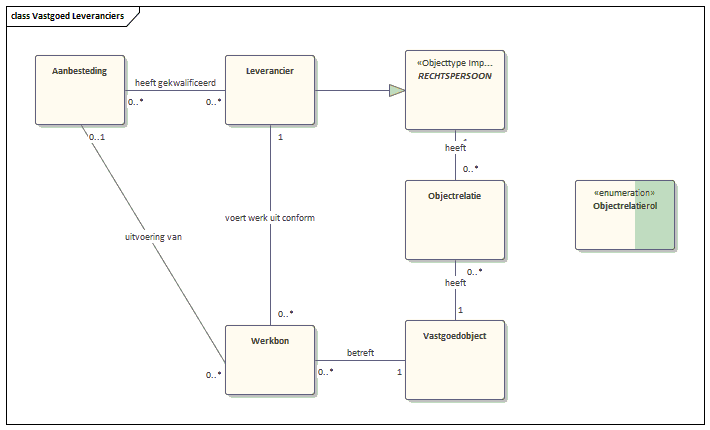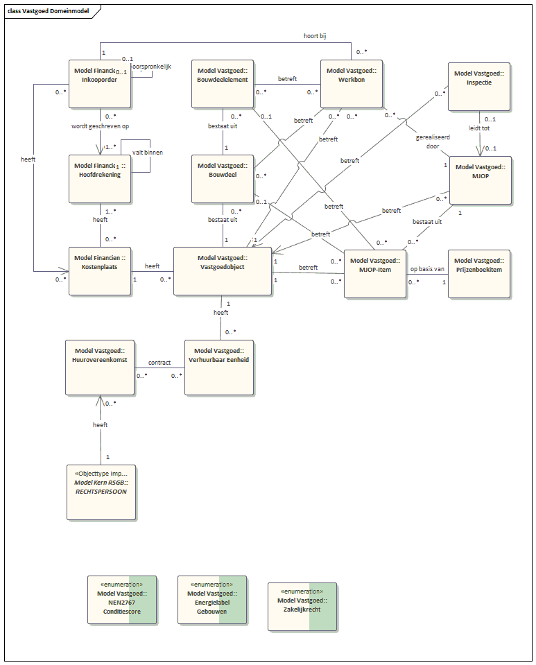Het vastgoed van de gemeente betreft kadastrale onroerende zaken. Dit objecttype is overgenomen uit de Kern:RSGB. Voor deze onroerende zaken is het objecttype ‘Object’ gedefinieerd. Deze objecten kunnen uit bouwdelen en bouwdeelelementen bestaan. Alle objecten en bijbehorende bouwdelen en bouwdeelelementen worden opgenomen in een MJOP (Meerjarig Onderhoudsplan). Koppeling in het gegevensmodel verloopt via de MJOP-Items. Bij het feitelijk uitvoeren van werkzaamheden wordt een ‘Werkbon’ aangemaakt die de wordt gebruikt als opdracht voor werkzaamheden door een ‘Leverancier’. Een ‘Leverancier’ kan een aanbesteding hebben gewonnen. Huurcontracten en koopcontracten worden volgens Kern:RSGB gemodelleerd via het objecttype ‘Zakelijk Recht’. Hieraan is danwel een eigenaar danwel een huurder gekoppeld. Beiden zijn ‘RECHTSPERSOON’ uit de Kern: RSGB. Het ‘Object’ is gekoppeld aan een ‘Kostenplaats’ uit het financiële model en de ‘Werkbon’ hoort bij een ‘Verplichting’ uit het financiële model. Zo is de koppeling met financiën verankerd. Bovenstaande is weergegeven in onderstaande figuren.