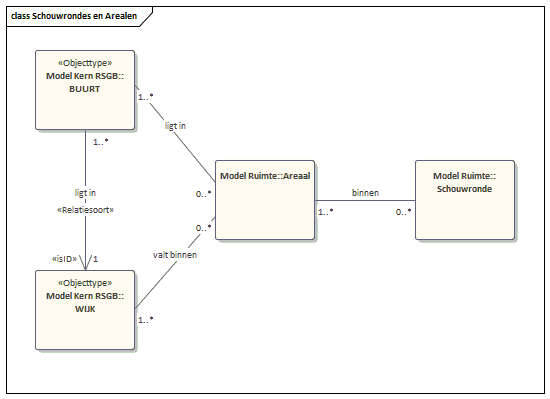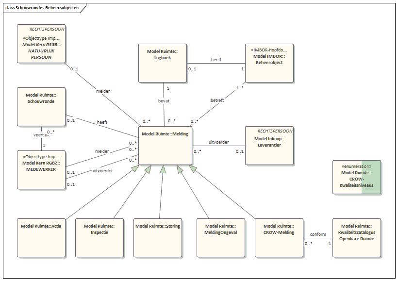 Een ‘Schouwronde’ kan meerdere meldingen hebben. Ieder van die meldingen heeft betrekking op een ‘beheerobject’, en beheerobjecten hebben een ‘logboek’ waar de meldingen in worden vastgelegd. Een ‘melding’ heeft een melder en een leverancier die de melding gaat verhelpen. Er zijn verschillende soorten meldingen: