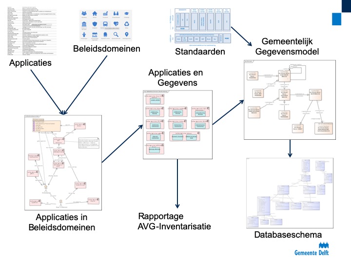 - Applicaties en gegevens: door in de gesprekken en uit de analyse de authentieke bronnen van gegevens te identificeren, door in de gesprekken in te zoomen op de gebruikte gegevens en door de inventarisatie van de applicaties en gegevens te hanteren zijn de gegevens binnen de authentieke bronnen geïdentificeerd.