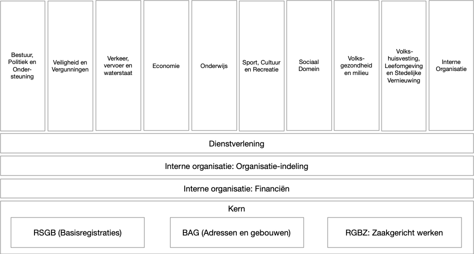 Het gegevensmodel is uitgewerkt in een aantal verticale beleidsdomeinen en 4 horizontale beleidsdomeinen. De horizontale delen (Kern, Financiën, ICT en Dienstverlening) vormen de basis van het gegevensmodel, waarop de verticale delen voortbouwen. De Kern bestaat uit RSGB en RGBZ, die de gegevensdefinities bevatten die zoals die gelden voor de basisregistraties (RSGB) en zaakgericht werken (RGBZ).