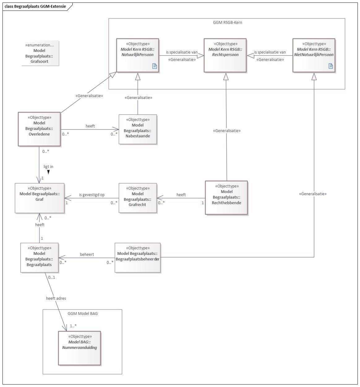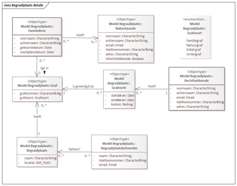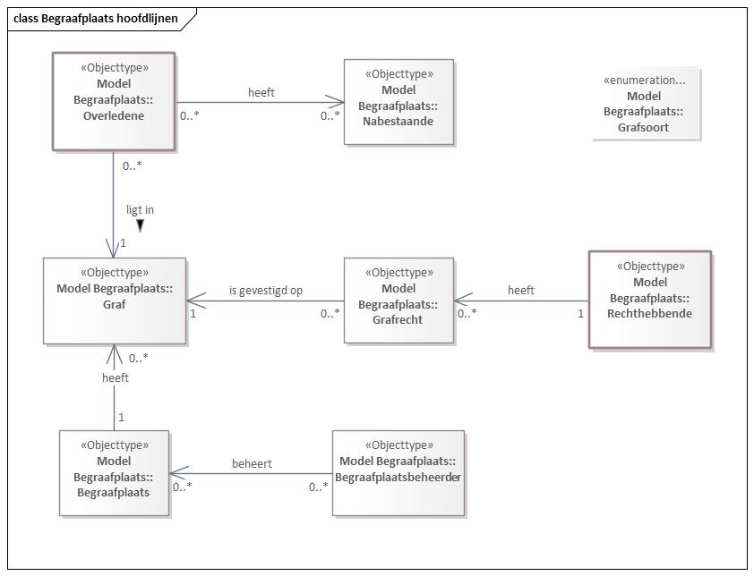 Het model is op hoofdlijnen in de volgende afbeelding uitgewerkt. Je ziet dat Objecttypes ook als Objecttype zijn aangeduid en dat ze gezamenlijk onderdeel uitmaken van Model Begraafplaats.