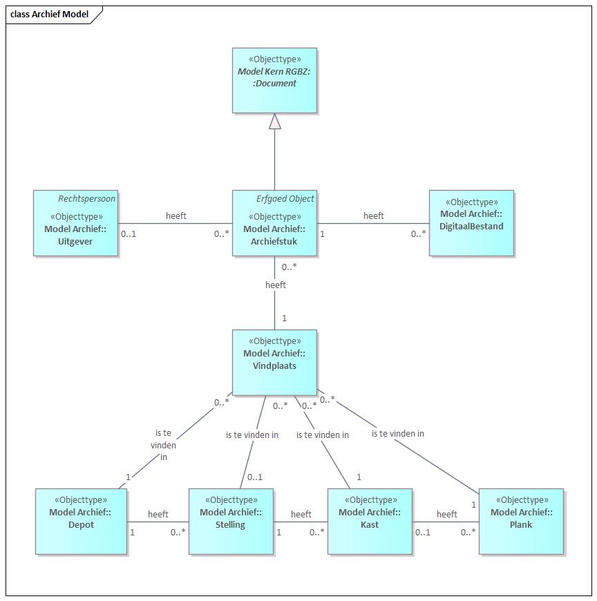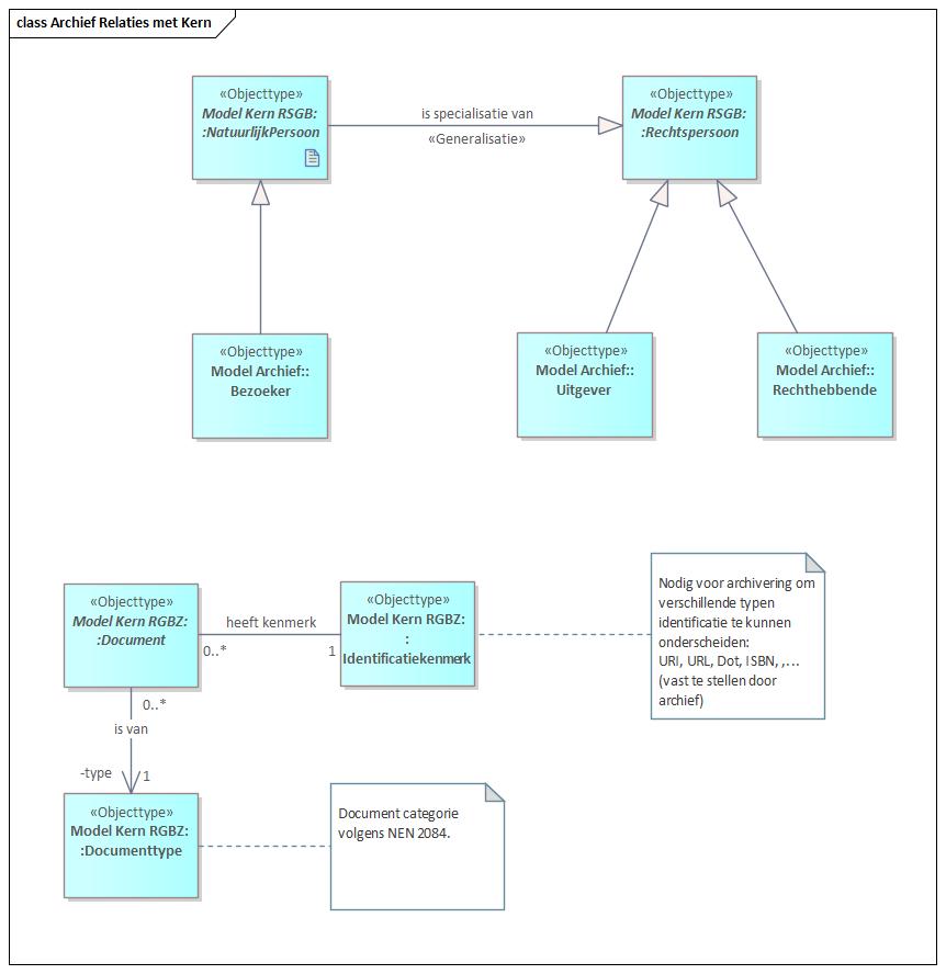 In voorgaande figuur is uitgewerkt dat uitgevers en rechthebbenden zijn afgeleid van het Kern RSGB-type ‘Rechtspersoon’. Het kunnen immers natuurlijke en niet natuurlijke personen zijn. Bezoekers en auteurs zijn altijd natuurlijke personen en om die reden afgeleid van het Kern RSGB-type ‘Natuurlijk Persoon’. Aan het RGBZ-type ‘Document’ is een ‘Identificatiekenmerk’ toegevoegd, zodat verschillende soorten identificaties (zoals: URI, URI, Dot, ISBN) zijn ondersteund. Archivering zal in de toekomst worden gedaan op basis van de Kern RGBZ-entiteit ‘Zaak’ en verloopt dan via zaak.archiefnominatie.
