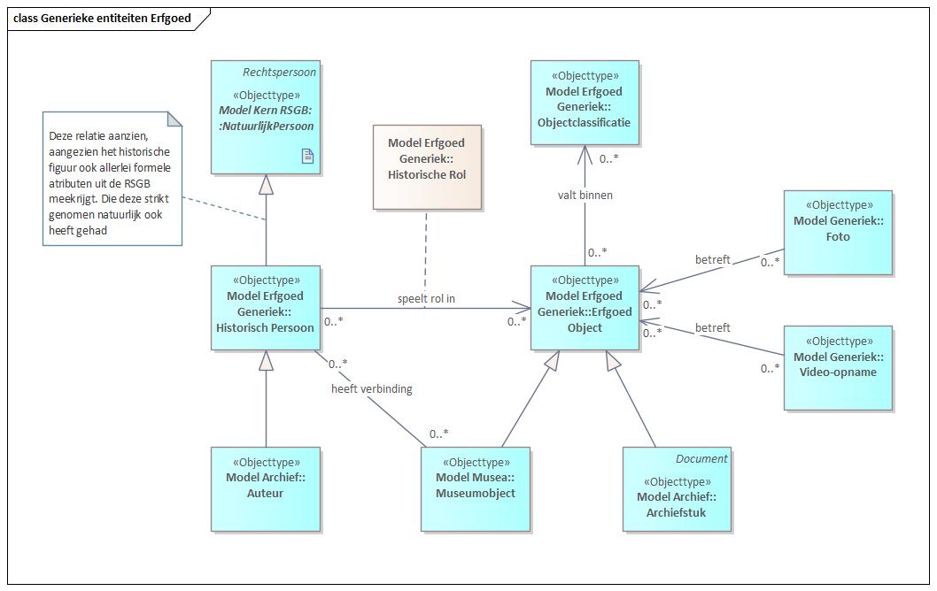 Generieke gegevensmodel Erfgoed In de volgende figuur 6 is de relatie van de objecttypen van het Prinsenhof te zien in relatie tot de generieke Erfgoed gegevensdefinities. Een ‘Museumobject’ is een ‘Erfgoedobject’ en op deze manier zijn foto’s en video’s gekoppeld aan het ‘Museumobject’. Ook is te zien hoe historische personen gekoppeld zijn aan erfgoedobjecten. Bovendien zijn historische personen afgeleid van het objecttype ‘Natuurlijk Persoon’, en krijgen zo attributen als naam, geboortedatum, sterfdatum en geslacht.
