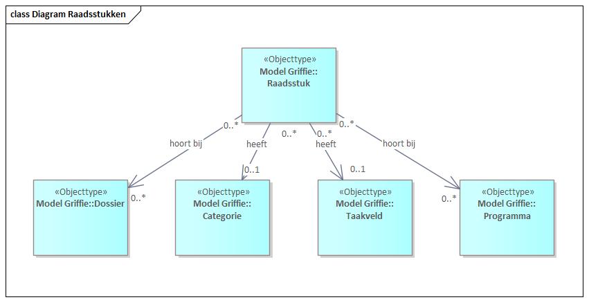 Vergaderingen hebben meerdere Aanwezige Deelnemers. Een ‘Aanwezige Deelnemer’ kan een ‘Collegelid’, een ‘Raadslid’ en een ander ‘NATUURLIJK PERSOON’ zijn. Een ‘NATUURLIJK PERSOON’ wordt gebruikt als een derde (burger of vertegenwoordiger) inspreekt op een vergadering. Hier wordt geen gebruik gemaakt van ‘RECHTSPERSOON’ omdat alleen natuurlijke personen kunnen spreken. Eventuele bedrijven of organisaties die vertegenwoordigd worden staan opgenomen in ‘Deelnemer’. Commissies kunnen meerdere Raadsleden als lid hebben, bovendien hebben Commissies vergaderingen. Raadsstukken kennen categorisering om de vindbaarheid te vergroten. Deze is opgenomen in onderstaand figuur. Hierin is te zien dat Raadsstukken bij meerdere dossiers kunnen horen, een ‘Categorie’ kunnen hebben, een ‘Taakveld’ kunnen hebben en kunnen horen bij meerdere Programma’s.