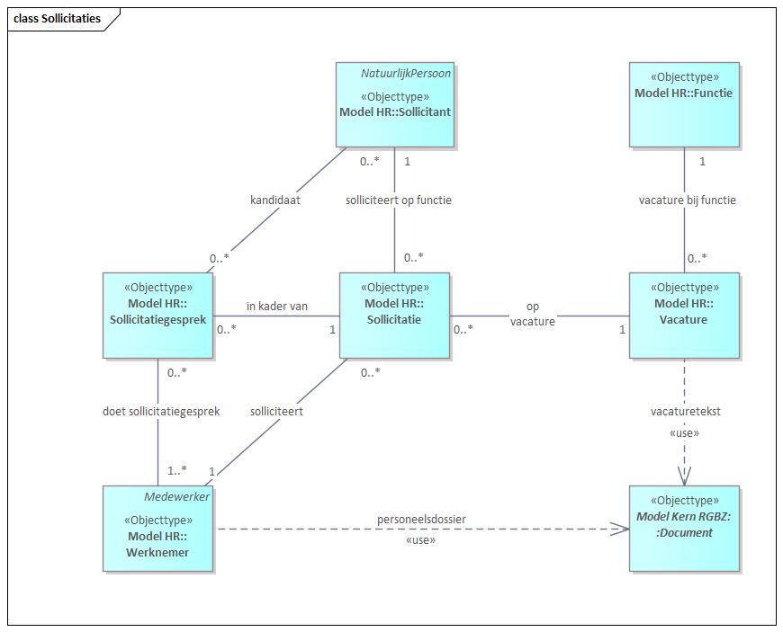 In bovenstaand figuur staat de ‘Sollicitatie’ beschreven, welke altijd is op een ‘Vacature’. Een ‘Vacature’ hoort altijd bij 1 functie en kan meerdere vacatureteksten hebben. ‘Sollicitanten’ doen ‘Sollicitaties’ en kunnen meerdere gesprekken hebben, waarbij 1 of meer ‘Werknemers’ betrokken zijn.
