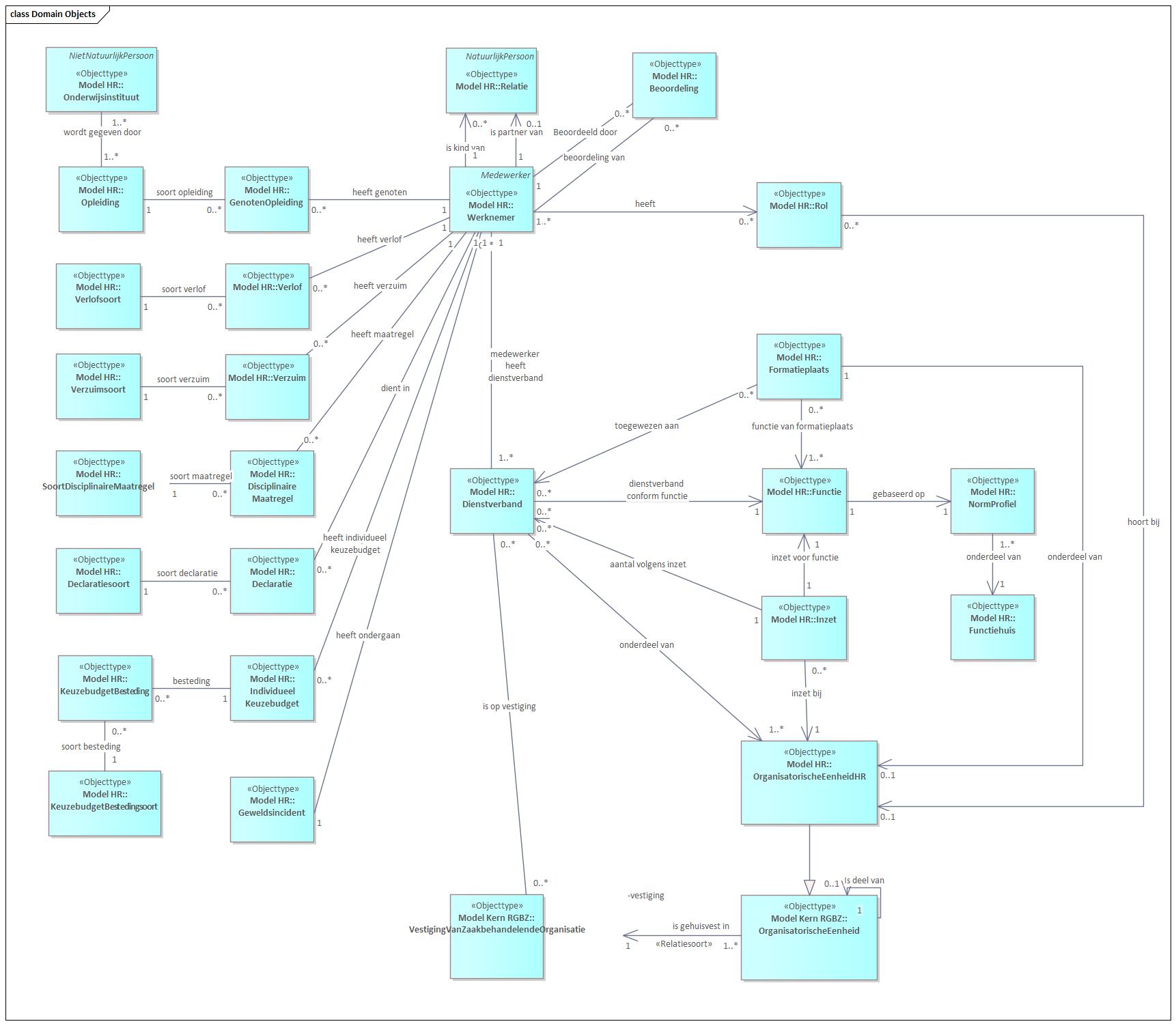 Centraal staat de ‘Werknemer’ die 1 of meer ‘Aanstellingen’ heeft, en daarnaast: ‘Verlof’, ‘Verzuim’ en een individueel keuzebudget. Deze laatste 3 hebben allemaal stamgegevens, waarin verschillende soorten zijn gedefinieerd. Zoals verschillende soorten verlof: zwangerschapsverlof, ouderschapsverlof, bijzonder verlof en regulier verlof.