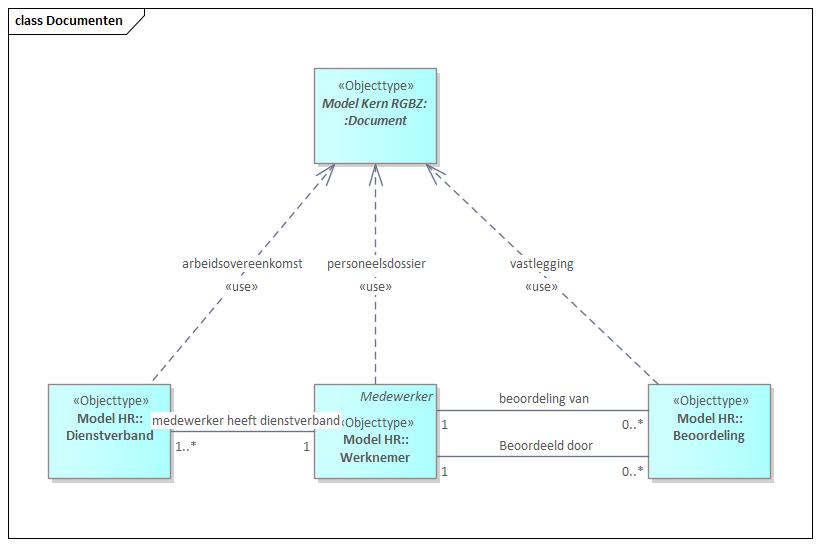 Het HR-model gebruikt niet direct ‘DOCUMENT’ uit RGBZ, maar alleen afgeleide documenten. Er kunnen verschillende typen documenten gebruikt worden: ‘Arbeidsovereenkomst’, ‘Personeelsdocument’ waarin allerlei personeelsafspraken staan vastgelegd en kan gebruikt worden voor andere communicatie en ‘Vacaturetekst’.