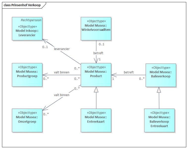 In het gegevensmodel Verkoop staat het te verkopen ‘Product’ centraal. Een ‘Entreekaart’ is een afgeleide van product, en is gemodelleerd als iets dat net als de andere producten verkocht kan worden. Alle producten hebben 0 of meer productgroepen en omzetgroepen. Daarnaast kan een ‘Product’ een ‘Leverancier’ hebben. Een ‘Product’ kan een ‘Voorraaditem’ hebben, waarin het aantal op voorraad is vastgelegd. Producten kunnen meerdere ‘Balieverkoop’ hebben, waarmee wordt aangegeven hoeveel en wanneer er van een bepaald product is verkocht. Een ‘Balieverkoop Entreekaart’ is een afgeleide van een ‘Balieverkoop’ en biedt de mogelijkheid om specifieke zaken van een entreekaart vast te leggen, zoals de moment en de duur van de geldigheid.