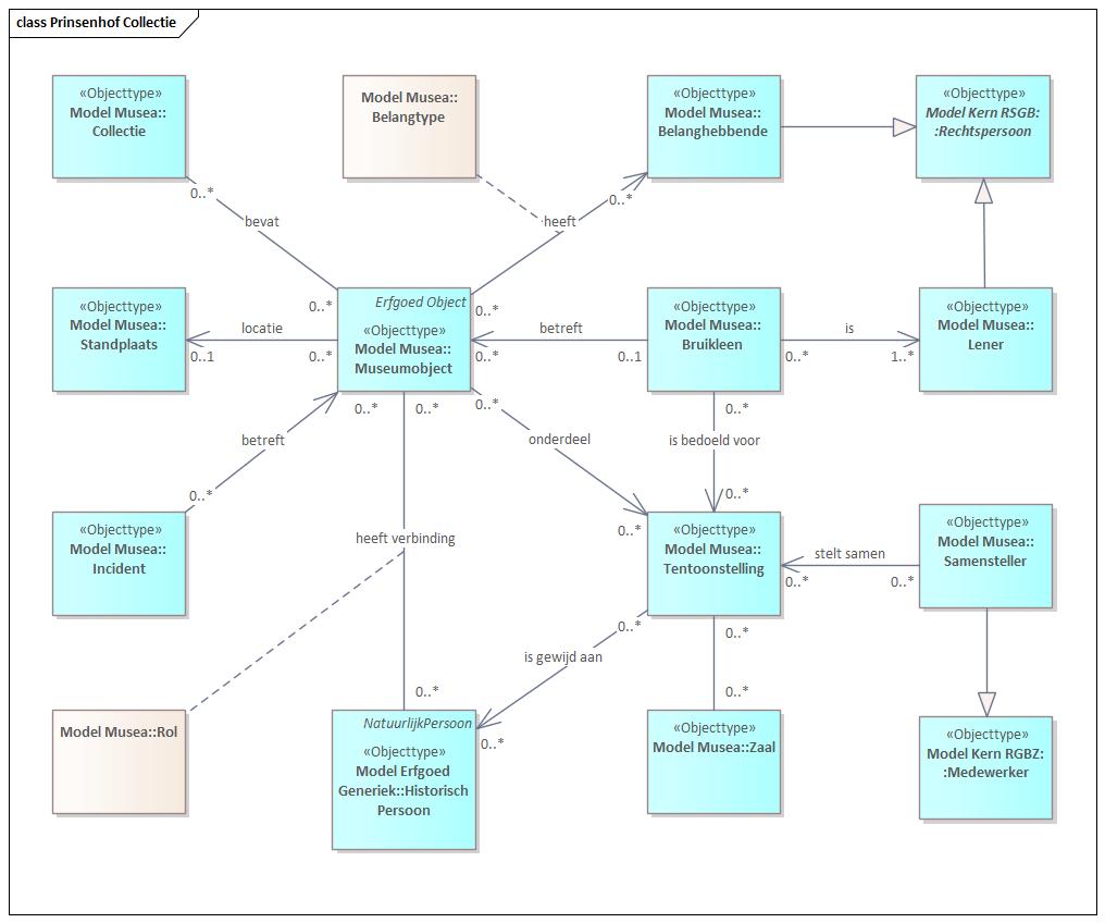 Binnen de ‘Collectie’ staan de objecten die bij het museum horen centraal. Deze zijn ‘Museumobject’ genoemd. Museumobjecten hebben een ‘Standplaats’ en kunnen in bruikleen zijn, in dit geval hebben zij een ‘Bruikleen’-object aan zich gekoppeld. In het geval van een bruikleen is er een ‘Lener’ aan gekoppeld. Dit kan zowel het Museum Prinsenhof zelf zijn (het is uitgeleend), als een externe lener (het wordt geleend van). Leners zijn een ‘Rechtspersoon’: een natuurlijk persoon of een niet-natuurlijk persoon. Daarnaast kunnen museumobjecten een ‘Belanghebbende’ hebben. In dit geval heeft deze belanghebbende altijd een bepaalde rol tov het museumobject. Naast de collectie worden de tentoonstellingen geadministreerd, met daaraan gekoppeld de gebruikte zalen en de samenstellers van de tentoonstelling. Bij de tentoonstellingen wordt bijgehouden welke museumobjecten onderdeel uitmaken van de tentoonstelling. Ook worden historische personen geadministreerd, en hun relatie tot museumobjecten via de Rol. Daarnaast worden incidenten geadministreerd en zijn deze gekoppeld aan de museumobjecten. Voorgaande is uitgewerkt in de volgden figuur.