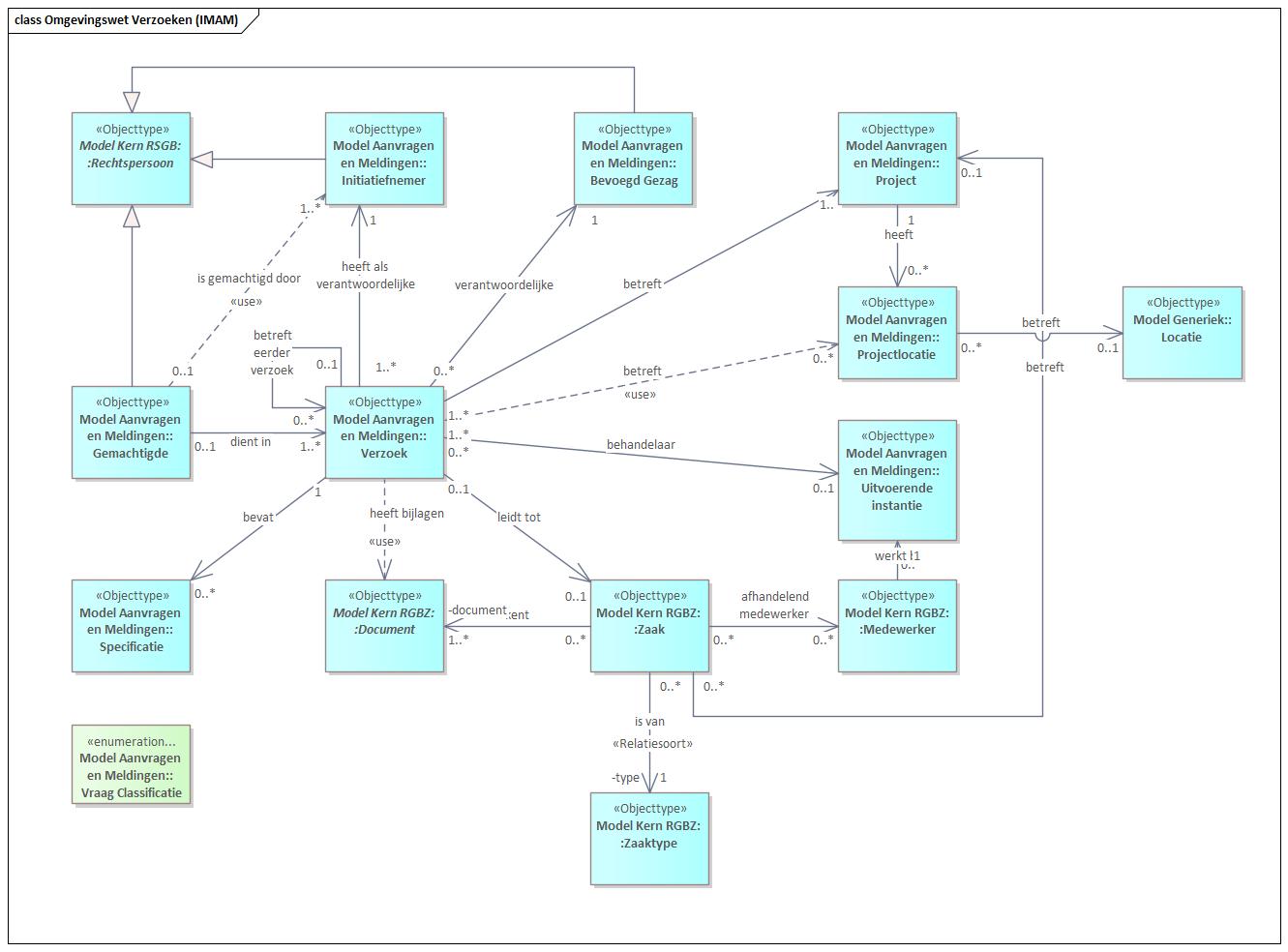 Centraal in het model staat het ‘Verzoek’. Een (ingediend) Verzoek is een aanvraag voor een vergunning of een melding, een aanvulling op een vergunningsaanvraag, of een intrekking van een vergunningsaanvraag. Om een aanvulling of een intrekking te kunnen relateren aan het originele verzoek (of een eerdere aanvulling) heeft Verzoek een relatie met zichzelf (heeft betrekking op).