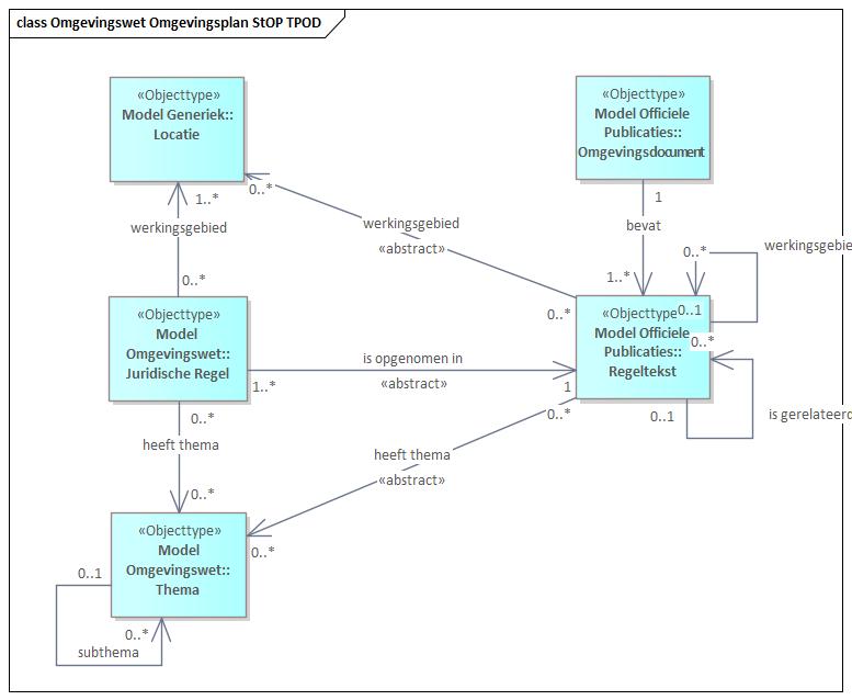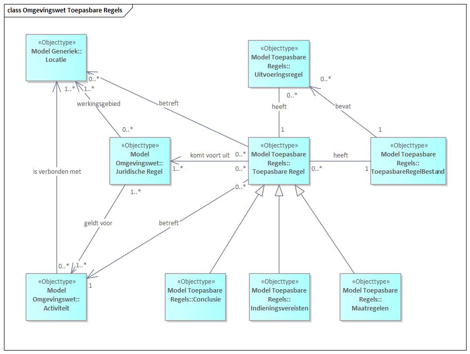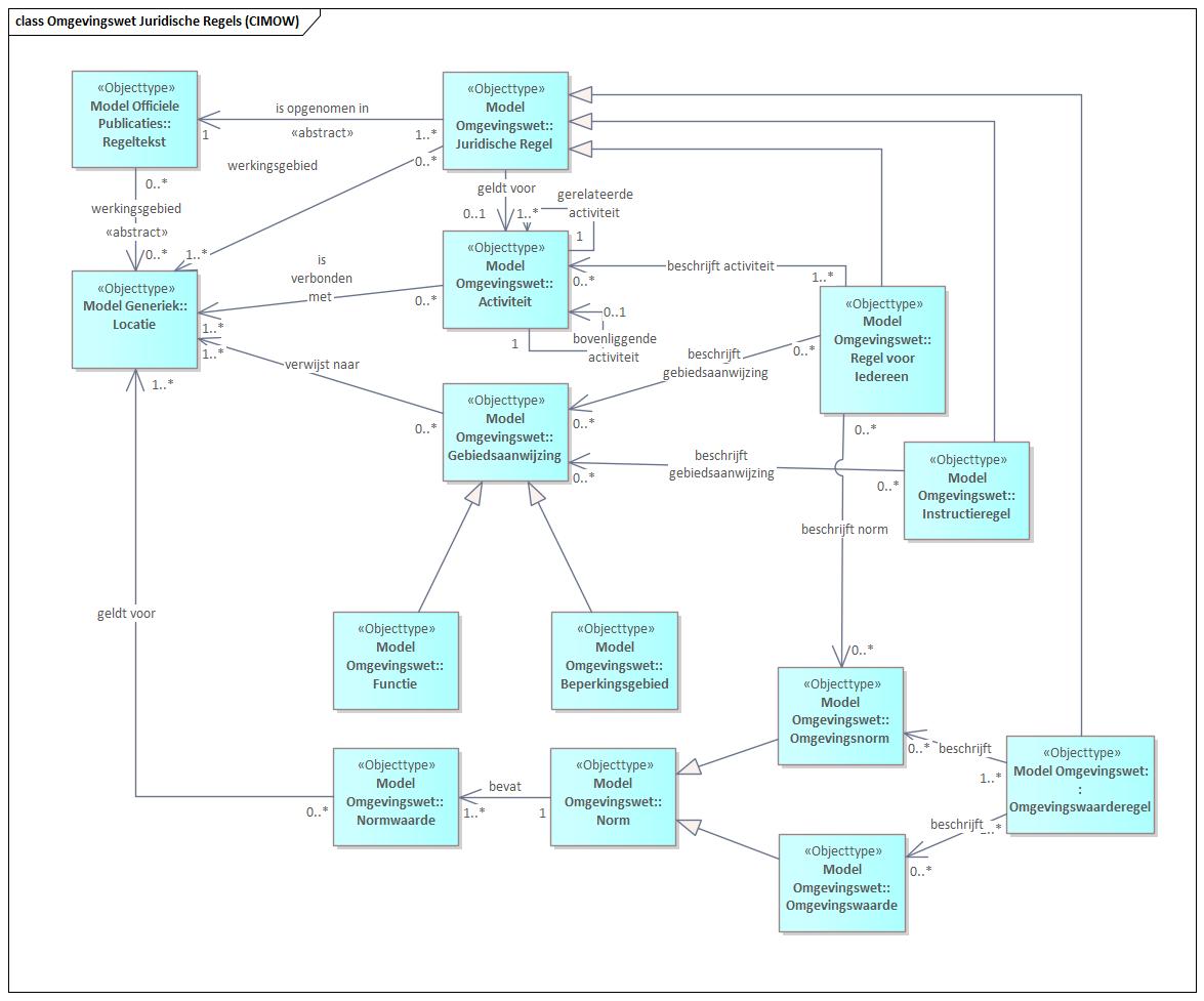 Dit diagram geeft een overzicht van alle onderkende objecttypen, zoals een activiteit, een regel, een functie, enzovoorts. Hierover wordt informatie bijgehouden, en worden verschillende soorten onderkend. Zo is een functie ‘horeca in het centrumgebied’ niet gelijk aan de functie ‘natuurgebied met water’, maar beide zijn wel een functie en worden informatiekundig als gelijksoortig gezien, te weten als een functie met een vrij te kiezen naam. Een ‘Regeltekst’ is de kleinste zelfstandige eenheid van (een of meer) bij elkaar horende Juridische regels in een tekst met Artikelstructuur, te weten een artikel of een lid. Een ‘Juridische Regel’ is opgenomen in een ‘Regeltekst’ (abstract vanwege annotatie). Een ‘Juridische Regel’ is regel met juridische werkingskracht. Een regel betreft binnen de Omgevingswet veelal activiteiten, en/of normen en/of gebiedsaanwijzingen. Er worden drie soorten juridische regels onderscheiden: