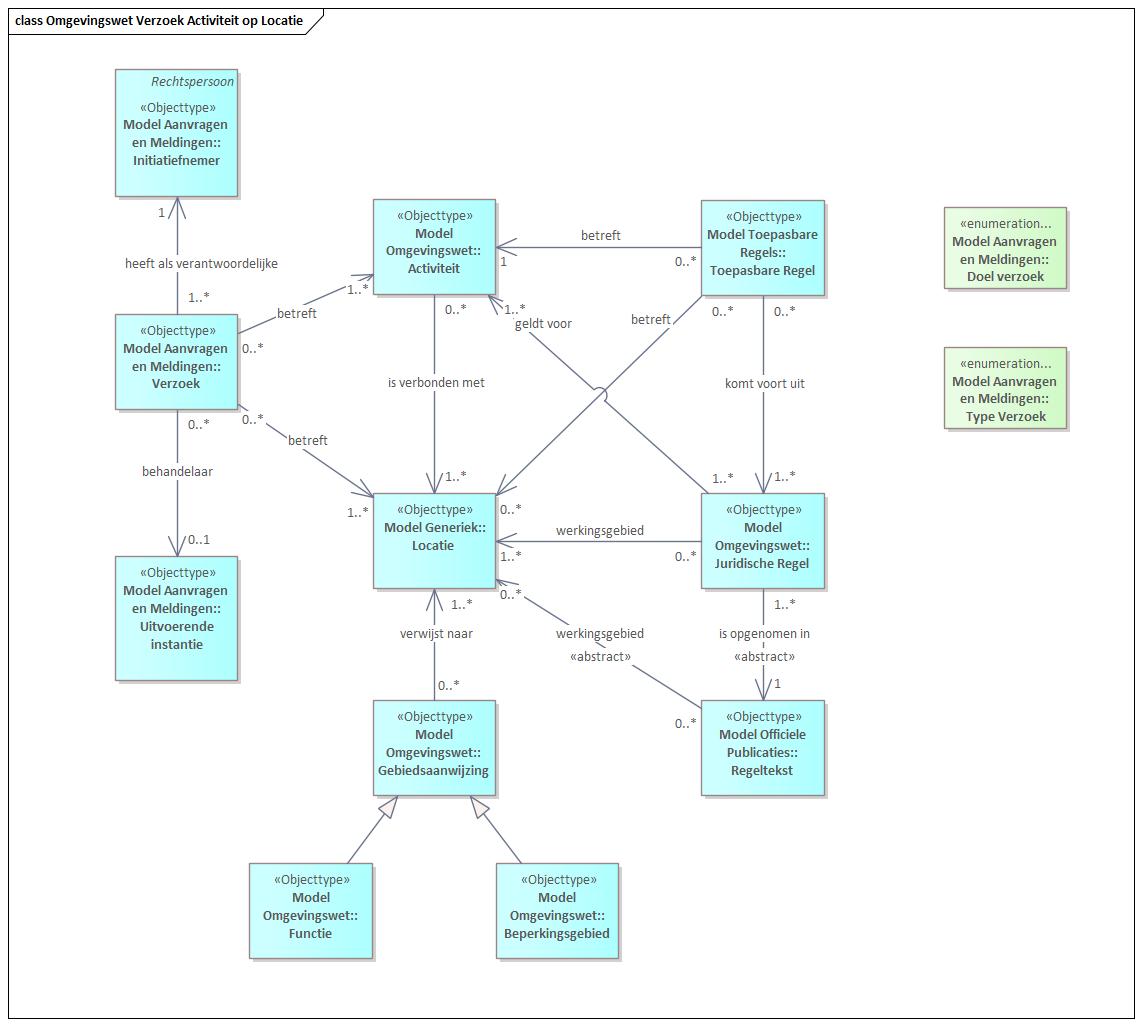 Centraal staan ‘Activiteit’ en ‘Locatie’. Verzoeken voor een omgevingsvergunning worden ingediend om een bepaalde activiteit op een bepaalde locatie uit te voeren. Daarnaast gelden er juridische regels voor activiteiten op bepaalde locaties. Deze juridische regels worden gegenereerd op basis van annotatie van regelteksten die onderdeel uitmaken van omgevingsdocumenten. Aan deze juridische regels zijn gebiedsaanwijzingen gekoppeld, waarmee een bepaalde functie kan worden bepaald of een beperkingsgebied wordt opgelegd.