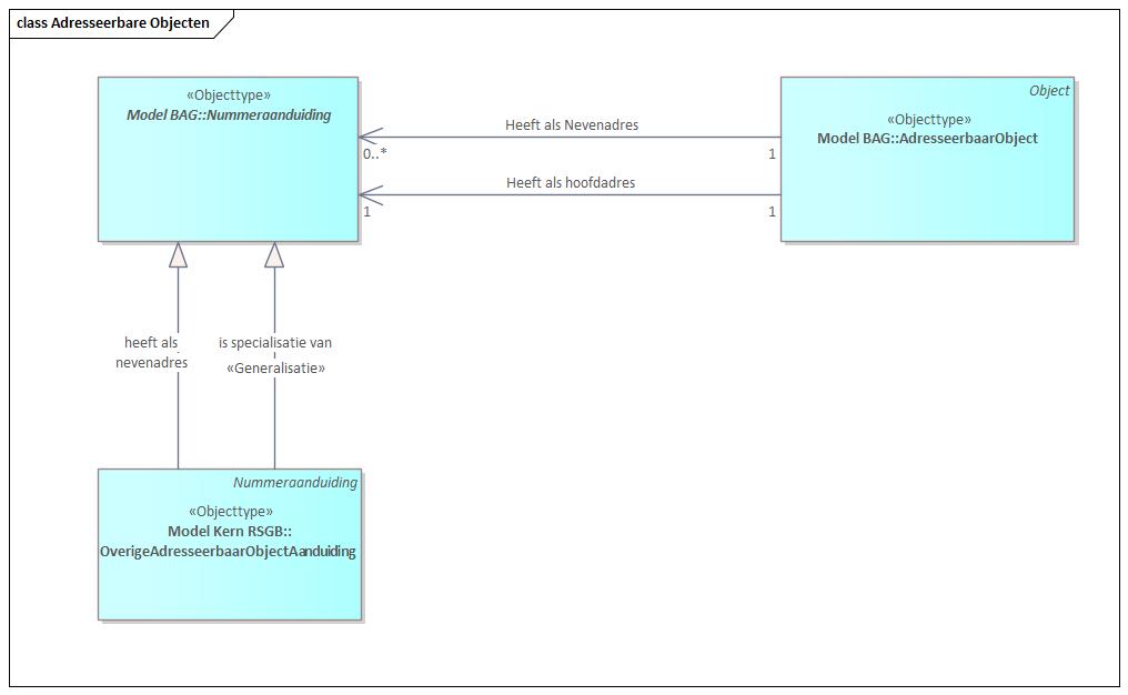 Het betreft allemaal objecttypen die vanuit de BAG adresseerbaar zijn, en dus een BAG-identificatie hebben. Ook hebben alle objecten een reëel adres met postcode en huisnummer. Met het meest generieke objecttype ‘Adresseerbaar Object Aanduiding ’ dat alle onderliggende objecttypen een reëel adres geeft, daaronder twee generieke objecttypes: ‘Nummeraanduiding’ en ‘Overig Adresseerbaar object aanduiding’, waarmee alle objecttypes een BAG-id meekrijgen. Zie hiervoor de volgende Figuur.