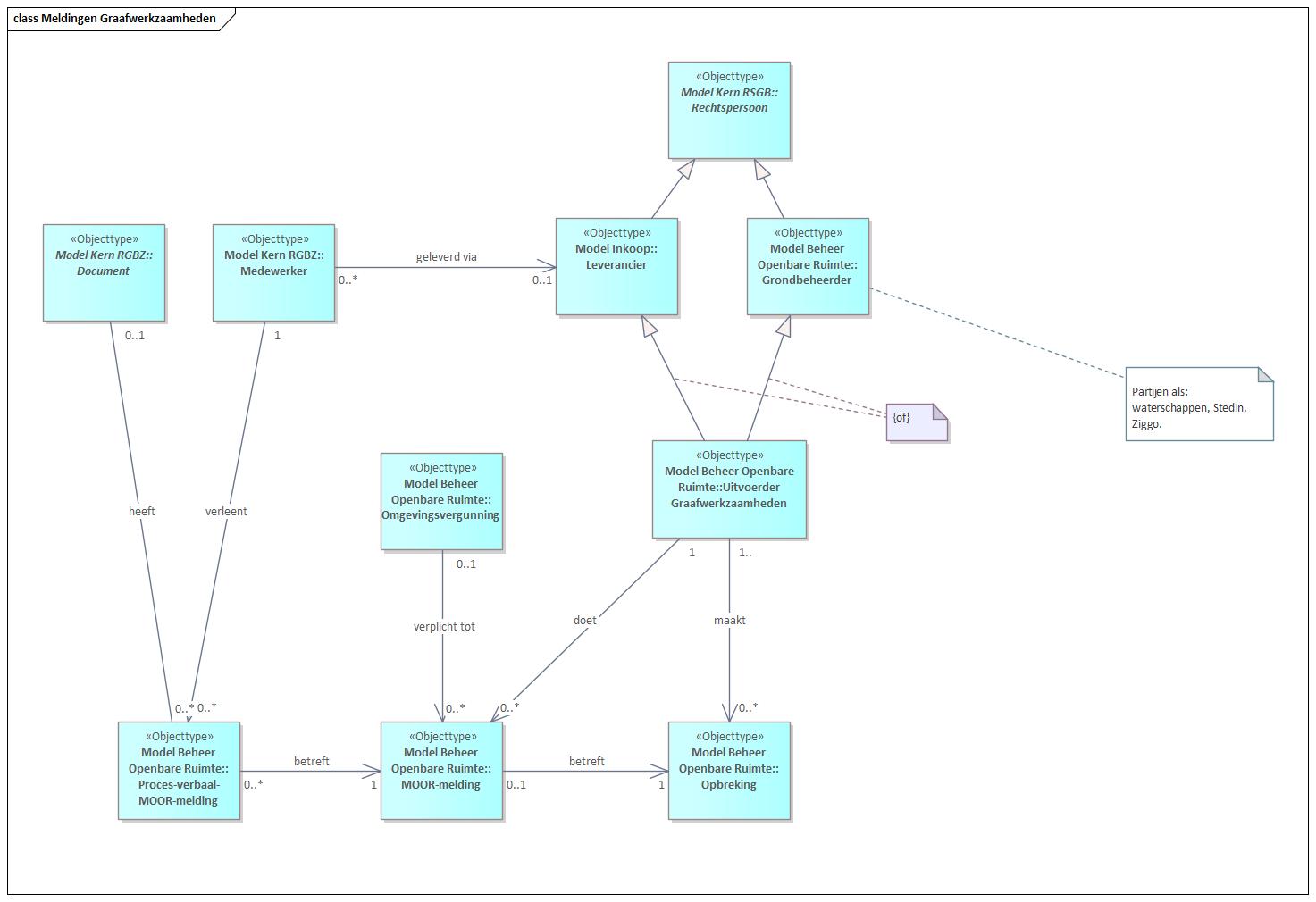 Voor geplande opbrekingen wordt een ‘MOOR-melding’ gedaan (Melding Opbreking Openbare Ruimte). Deze ‘MOOR-melding’ wordt gedaan door de ‘Uitvoerder’ van de graafwerkzaamheden. Een ‘Uitvoerder’ kan een ‘Leverancier’ zijn of een ‘Grondbeheerder’, beiden een ‘Rechtspersoon’. Een aangevraagde ‘Omgevingsvergunning’ kan meerdere MOOR-meldingen verplichten. Nadat de graafwerkzaamheden zijn uitgevoerd wordt een inspectie gedaan voor een ‘Medewerker’ van de gemeente, waarvan een ‘proces verbaal’ wordt opgemaakt. Dit ‘proces verbaal’ is vastgelegd in een ‘Document’.