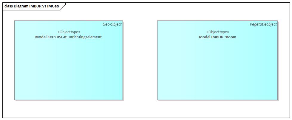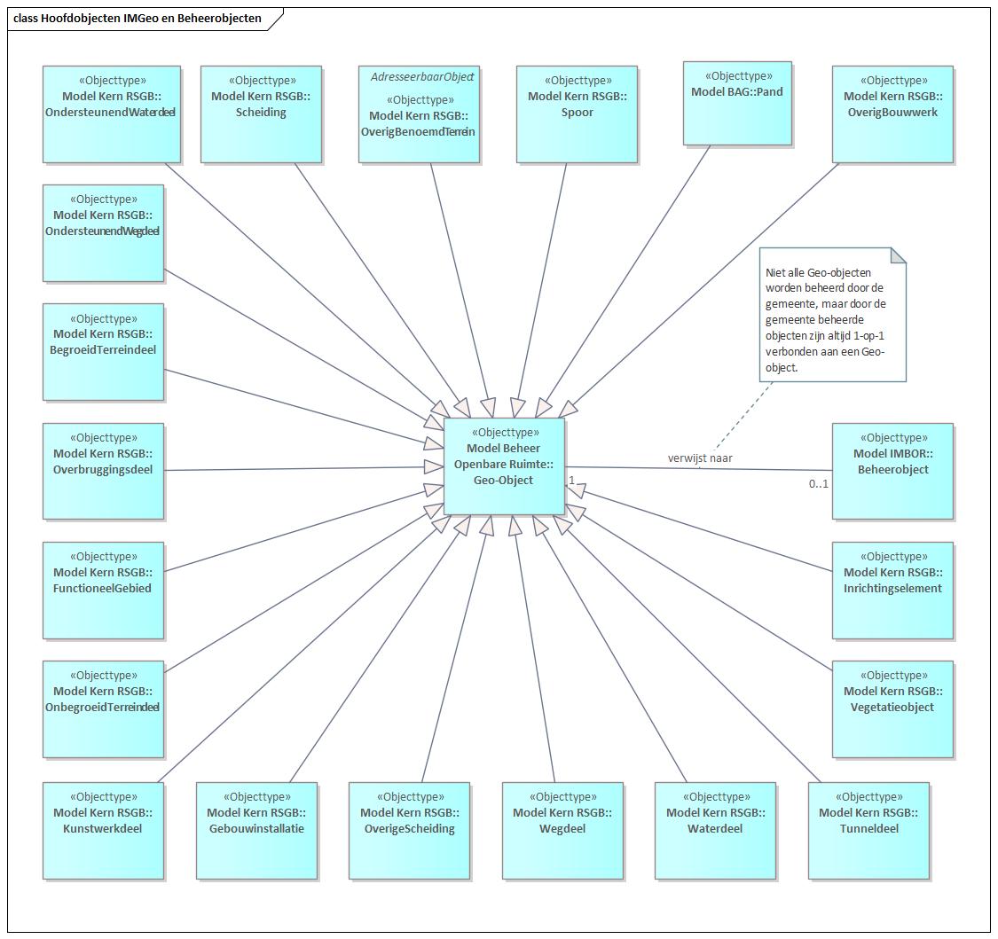 In voorgaand figuur is te zien hoe alle Geo-objecten uit de RSGB zijn afgeleid van het objecttype Geo-Object, en hoe deze is gekoppeld aan het objecttype Beheerobject uit IMBOR. De getoonde objecttypen zijn allemaal overgenomen uit IMGeo, waardoor de aansluiting is gemaakt met de BGT.