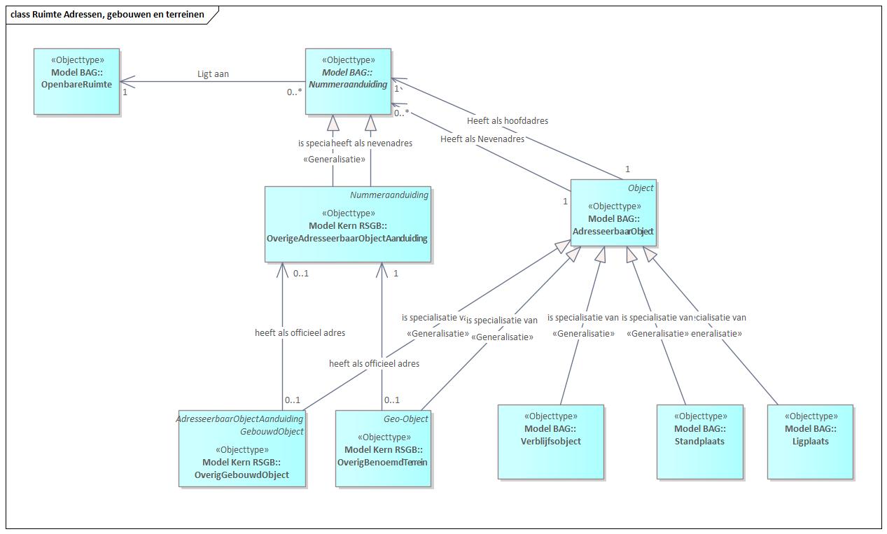 Het IMBAG (Informatiemodel basisregistratie, adressen en gebouwen) is overgenomen in RSGB 3.0. Om deze reden zijn de objecttypes hiervoor ontleend aan het RSGB 3.0.