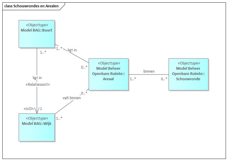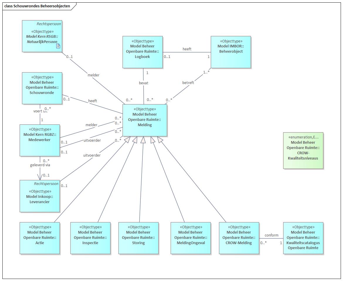 Een ‘Schouwronde’ kan meerdere meldingen hebben. Ieder van die meldingen heeft betrekking op een ‘beheerobject’, en beheerobjecten hebben een ‘logboek’ waar de meldingen in worden vastgelegd. Een ‘melding’ heeft een melder en een leverancier die de melding gaat verhelpen. Er zijn verschillende soorten meldingen: