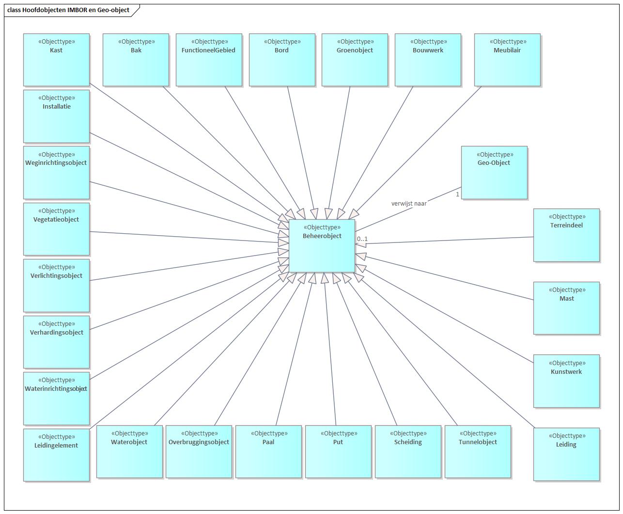 In voorgaande figuur is te zien welke beheerobjecten uit IMBOR in het gemeentelijk gegevensmodel zijn overgenomen, en hoe deze zich verhouden tot de Geo-objecten. Hier zijn alleen de hoofdobjecten overgenomen, die allemaal afgeleid zijn van beheerobject. Er is ook een set beheerobjecten die weer zijn afgeleid van deze hoofdobjecten. Het betreft de volgende objecttypes: