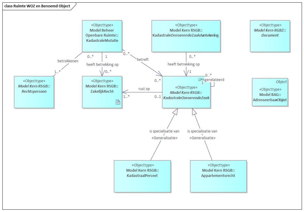 Kadastrale objecten worden gebruikt voor het toepassen van een zakelijk recht op een object. In de RSGB 3.0 kan een perceel of een appartementsrecht zijn. Een zakelijk recht kan zijn: eigendomsrecht, mede-eigendom, appartementsrecht, recht van vruchtgebruik, recht van gebruik en recht van bewoning, erfdienstbaarheden, erfpacht en recht van opstal. Dit zakelijk recht kan een natuurlijk persoon als rechthebbende/subject hebben of een niet-natuurlijk persoon. In de volgende figuur is uitgewerkt hoe een ‘Zakelijk recht’ rust op een ‘Kadastrale Onroerende Zaak’. Zo’n ‘Kadastrale Onroerende Zaak’ kan van het soort ‘Kadastraal Perceel’ zijn of een ‘Appartementsrecht’, of het kan generiek blijven. Een publiek rechtelijke beperking uit de WKPB wordt gevestigd via een ‘Kadastrale onroerende zaak aantekening’. De verbinding met adresseerbare objecten uit de BAG wordt gelegd via de relatie met het meest generieke type ‘Benoemd Object’. Een ‘Rechtspersoon’ (natuurlijk persoon of bedrijf) heeft een ‘zakelijk recht’ en kan zo bijvoorbeeld het eigendom van een perceel hebben.