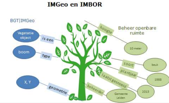 Er zijn twee perspectieven van een boom afgebeeld. In het BGT/IMGeo (RSGB 3.0) domein worden attributen getoond die te maken hebben met het op de juiste plek kunnen afbeelden van de boom. In het beheerdeel worden attributen bijgehouden die nodig zijn om de boom te kunnen beheren. In de volgende figuur is te zien welke verschillende soorten informatie over hetzelfde objecttype wordt bijgehouden.