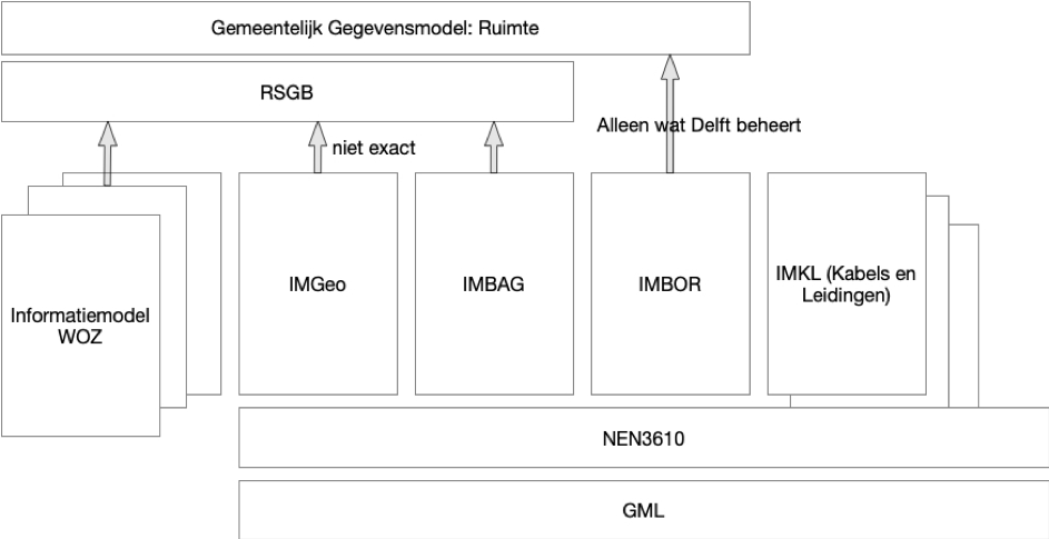 Voor zover van toepassing op Delft wordt zoveel mogelijk van deze standaarden gebruik gemaakt. Ook is er een aantal objecttypen die (nog) niet in deze modellen voorkomen, zoals het IMKL (Informatiemodel kabels en leidingen), IMWV (Informatiemodel Wegen en verkeer) en het IMWA (Informatiemodel Water). In de figuur hierna is te zien hoe de samenhang van deze standaarden in het Gemeentelijk Gegevensmodel is uitgewerkt.