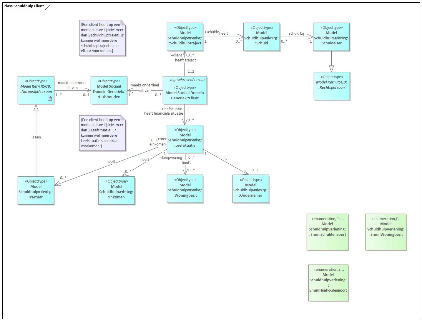 In het kader van de Schuldhulpverlening heeft een Client een Leefstituatie. In de tijd kan een Client slechts één vastgelegde Leefstituatie hebben. Na elkaar in de tijd kunnen dat meerdere vastgelegde Leefstituaties zijn. De Leefstituatie kent een volgende objecttypen: informatie over: een mogelijke partner of partners uit het verleden, het inkomen, een mogelijke koopwoning en een mogelijk ondernemerschap. Daarnaast zijn de schulden van de Client van groot belang. Een Client kan meerdere schulden hebben, en ieder van die schulden is bij een Schuldeiser. Een schuldeiser is een Rechtspersoon, dus kan een Natuurlijk Persoon zijn of een Niet Natuurlijk Persoon. De verschillende soorten mogelijke schulden zijn vastgelegd in EnumSchuldensoort en de verschillende soorten mogelijke schuldeisers zijn vastgelegd in EnumSchuleisersoort. De schulden die binnen de scope van het schuldhulptraject vallen, zijn gekoppeld aan het traject. Een schuldhulptraject vindt altijd plaats onder verantwoordelijkheid van een gemeente. (De gegevens over de leefsituatie worden niet aangeleverd aan het CBS, maar verrijkt door het CBS. Deze zijn dan ook niet in de uitwisselspecificatie opgenomen)