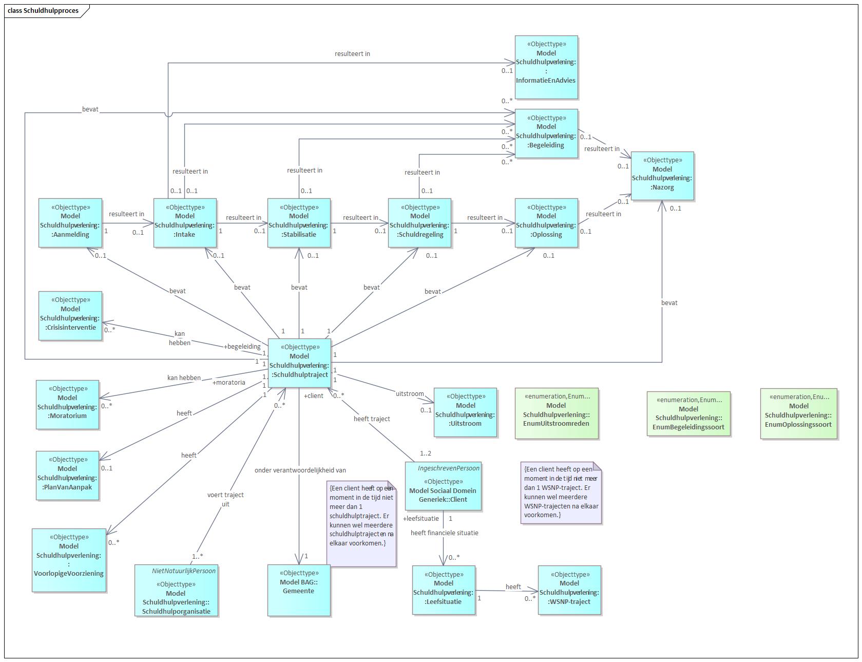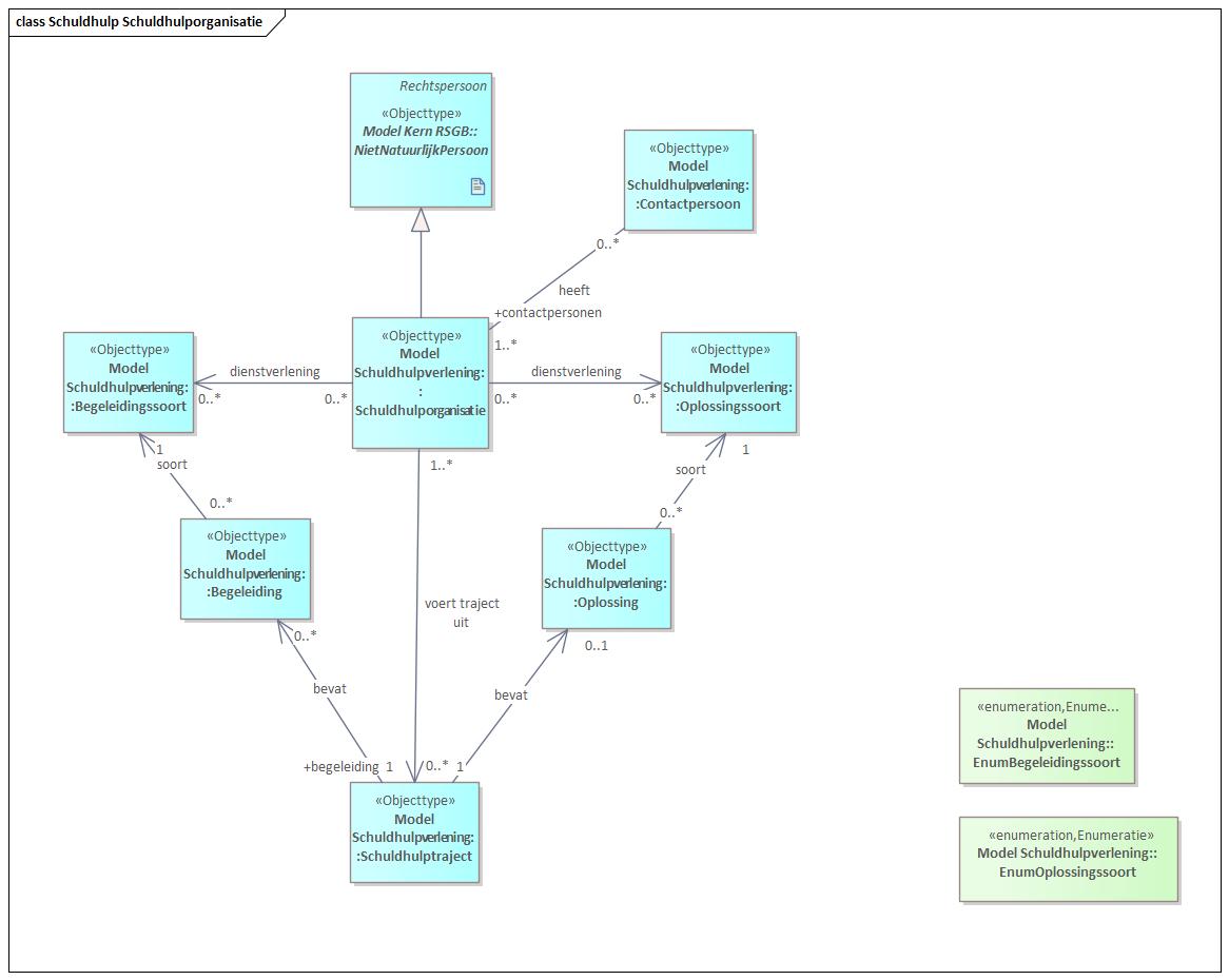 In bovenstaande figuur worden de volgende zaken weergegeven: Een Schuldhulporganisatie kan meerdere schuldhulptrajecten uitvoeren. Een Schuldhulporganisatie kan als dienstverlening meerdere soorten begeleiding en meerdere soorten oplossingen aanbieden. Alle Oplossingen binnen een Schuldhulptraject zijn van een bepaald soort, en hetzelfde geldt voor Begeleiding. De soorten mogelijke begeleiding zijn vastgelegd in EnumBegeleidingssoort en de soorten oplossingen in EnumOplossingssoort.