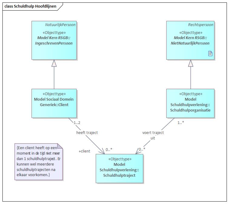 De kern van het informatiemodel Schuldhulpverlening bestaat uit een Schuldhulptraject dat wordt uitgevoerd voor 1 of 2 cliënten. In het geval cliënten getrouwd zijn en aansprakelijk zijn voor elkaars schulden maken zij onderdeel uit van hetzelfde schuldhulptraject. Het kan hier ook gaan om een partner waar inmiddels van is gescheiden, maar waar in het verleden gezamenlijk schulden mee zijn aangegaan. Een client kan tegelijkertijd maar één Schuldhulptraject hebben, maar wel in de tijd volgordelijk meerdere Schuldhulptrajecten hebben doorlopen.