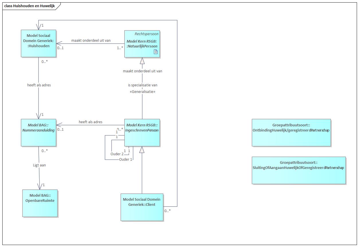 Er maakt tenminste 1 Natuurlijk Persoon deel uit van een Huishouden, en een Natuurlijk Persoon heeft maximaal 1 huishouden. Een Huishouden heeft altijd precies 1 adres. Er is gekozen het huishouden te koppelen aan Natuurlijk Persoon zodat ook niet geregistreerde personen deel kunnen uitmaken van een huishouden. Daarnaast is het Huwelijk of Geregistreerd partnerschap gekoppeld aan Natuurlijk Persoon en zijn de Groepsattribuutsoorten Sluiting en Ontbinding aan het Huwelijk gekoppeld.