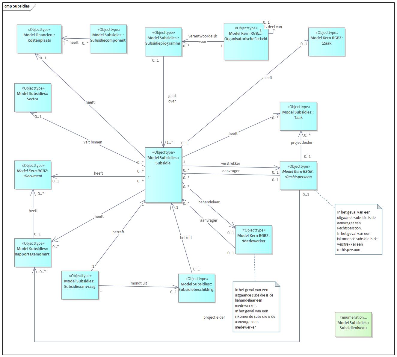 Een ‘Subsidie’ kan binnen een ‘Subsidieproject’ vallen, waarbinnen de doelstelling van dat programma is vastgelegd. Een ‘Subsidieproject’ valt binnen een ‘Subsidieprogramma’ dat is gekoppeld aan een ‘Kostenplaats’ en een ‘Organisatorische Eenheid’ (Afdeling). Subsidies vallen binnen een bepaalde ‘Sector’. Een subsidiedossier kan onder meerdere begrotingsposten hebben. Een begrotingspost heeft meerdere subsidiedossiers eronder hangen. ‘Component’ stelt ons in staat een subsidie in componenten over meerdere kostenplaatsen te verdelen.