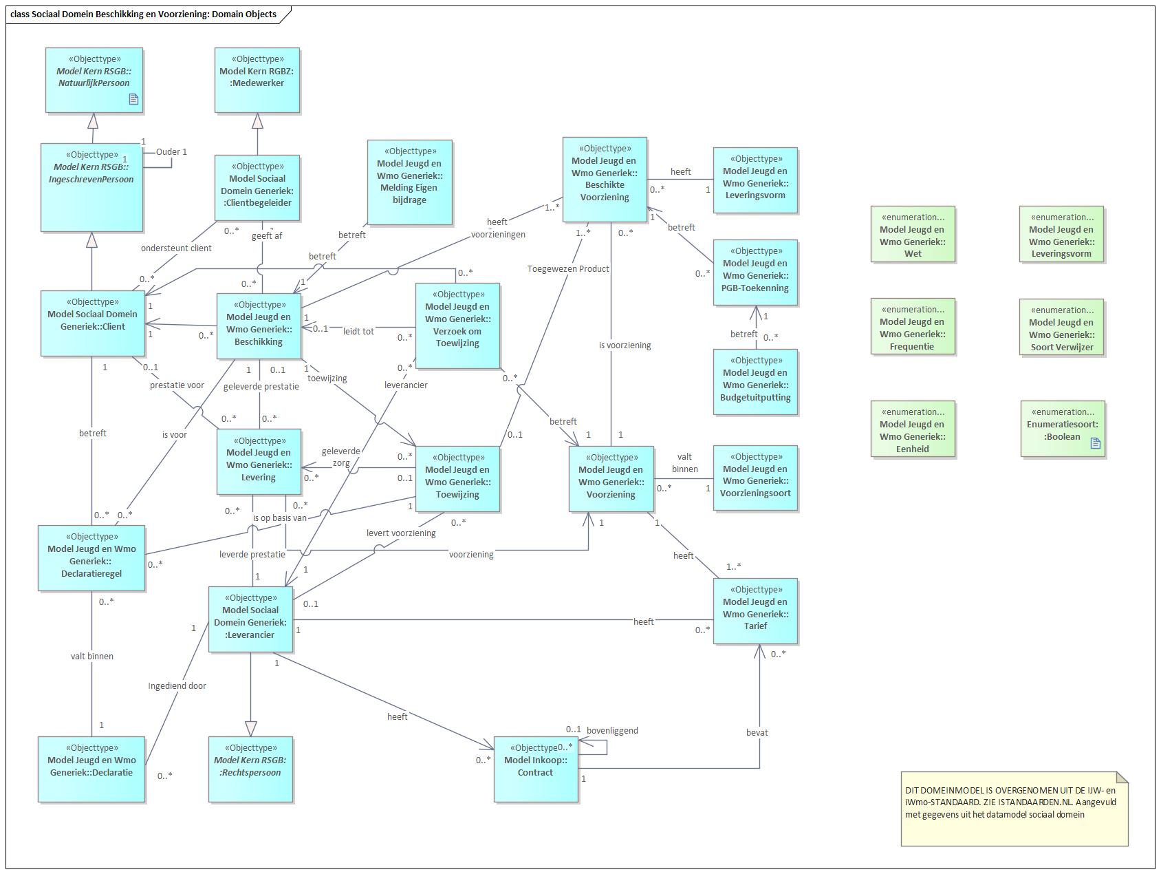 Het domeinmodel voor de Wmo en de Jeugdwet bouwt voort op het generieke datamodel van het sociaal domein. Het model steunt op de gegevensdefinities uit de iWmo, iJw en iPgb waarin het berichtenverkeer tussen gemeenten en zorgaanbieders staat beschreven.