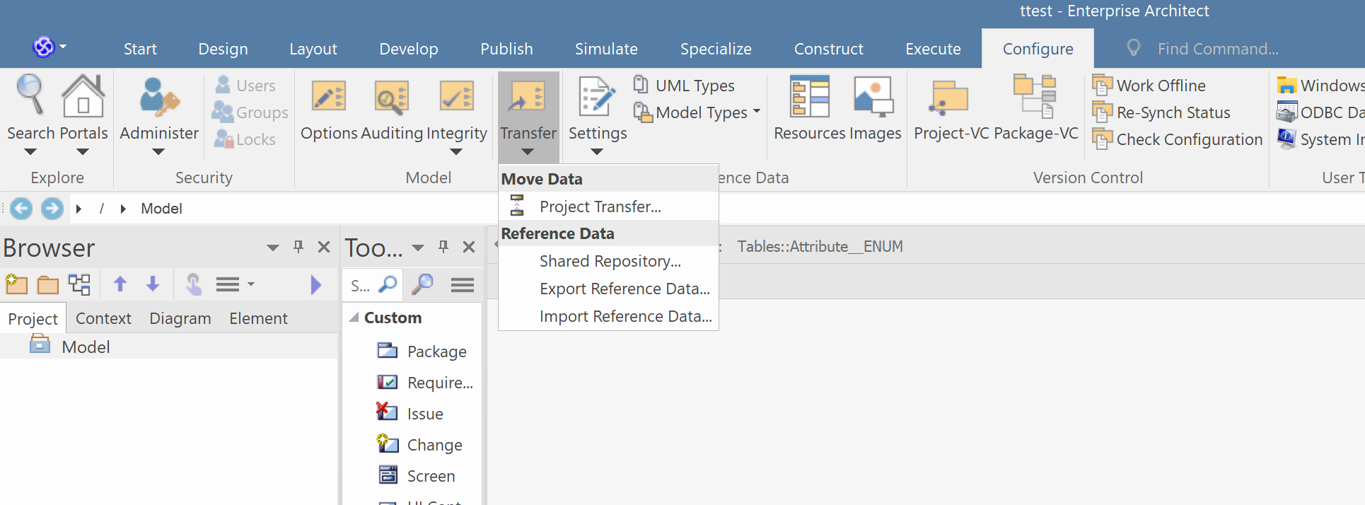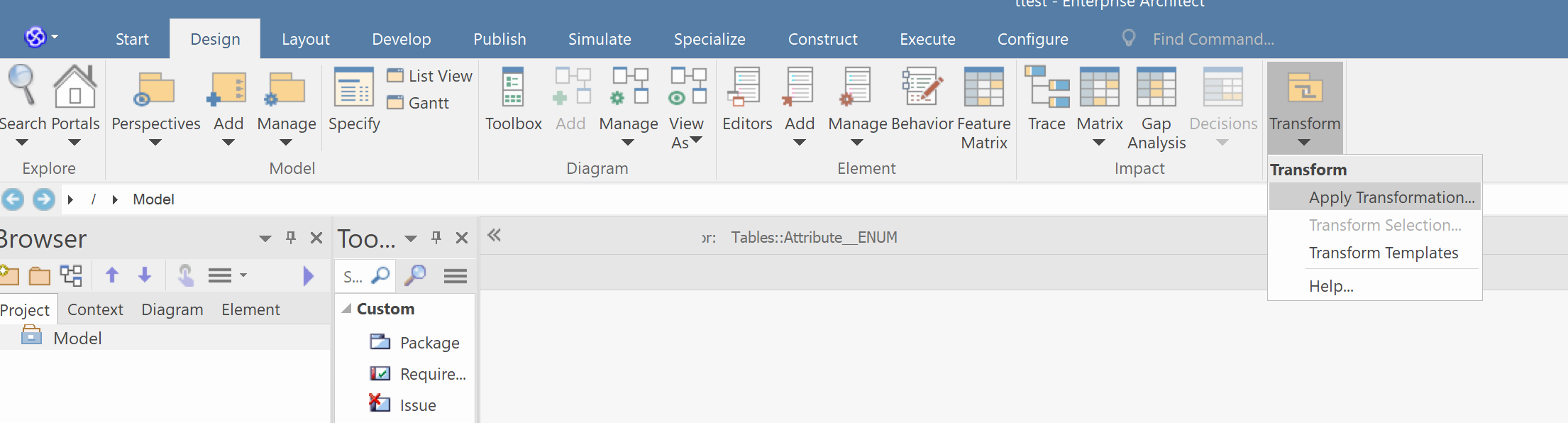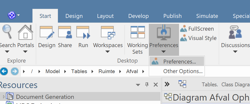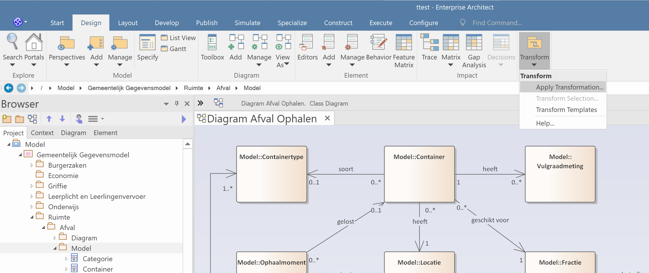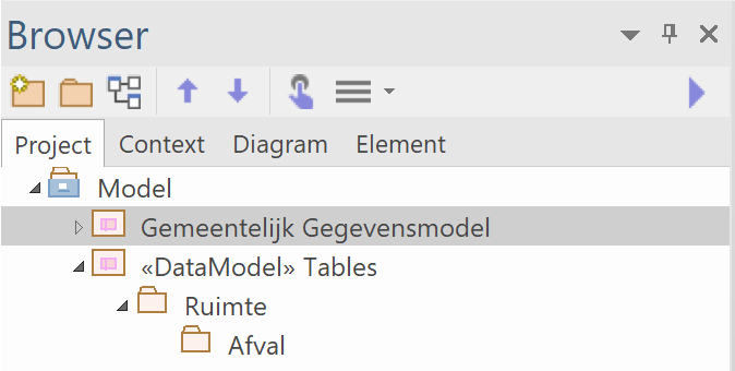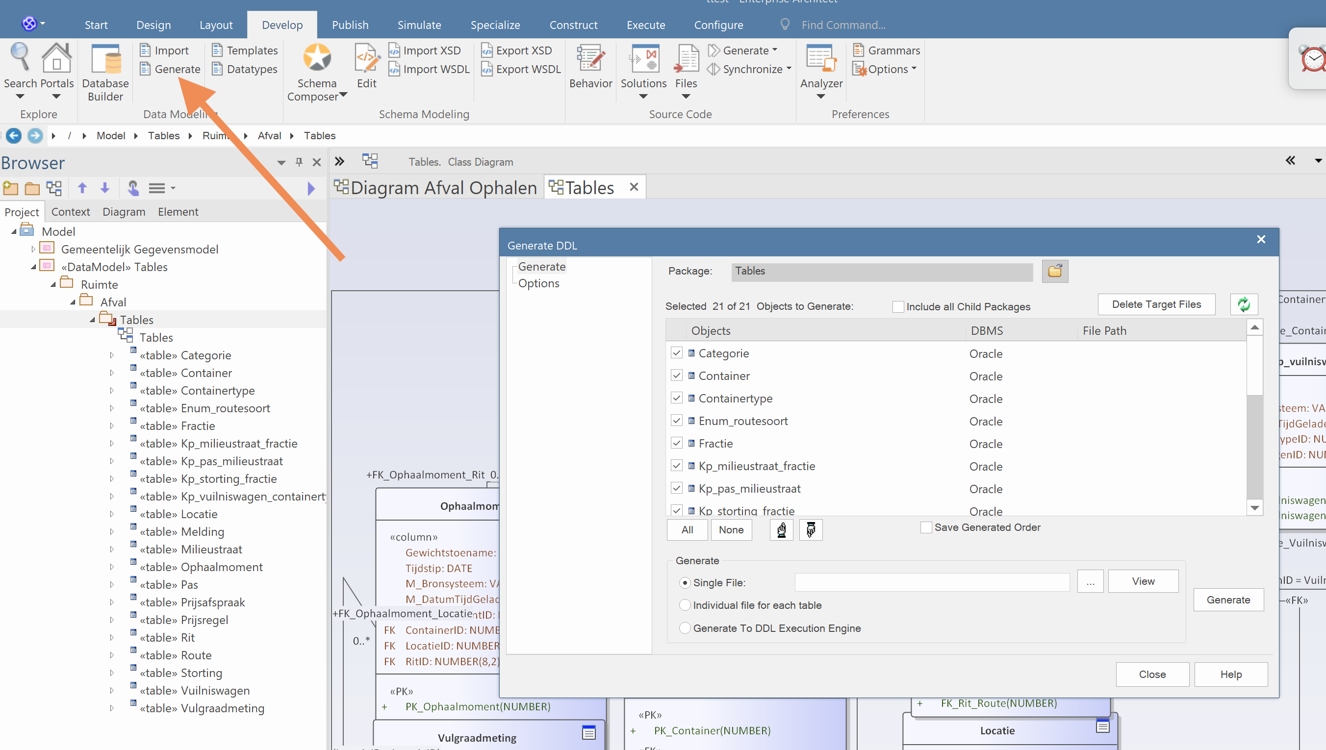 1. Selecteer het onderdeel van het model dat je wilt uitgenereren. In het voorbeeld de mapGemeentelijk Gegevensmodel/Ruimte/Afval/Model. je kunt ook in een diagram de gewenste objecttypen selecteren.