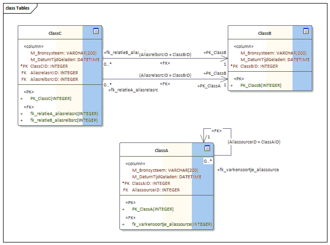 - Derde voorbeeld: tabel ClassE krijgt kolom AliasSourceCID (met index) en foreignkey-constraint (met in de naam de aliassen van source en target) op de relatie met tabel ClassF.