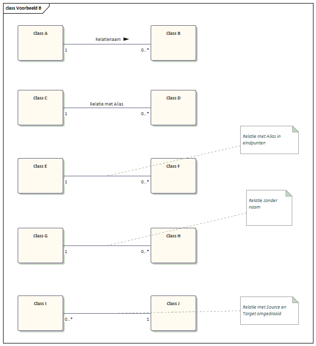 - Relatie Class I en Class J: relatie zonder naam en aliassen, maar Source en Target omgedraaid t.o.v. het vorige voorbeeld.