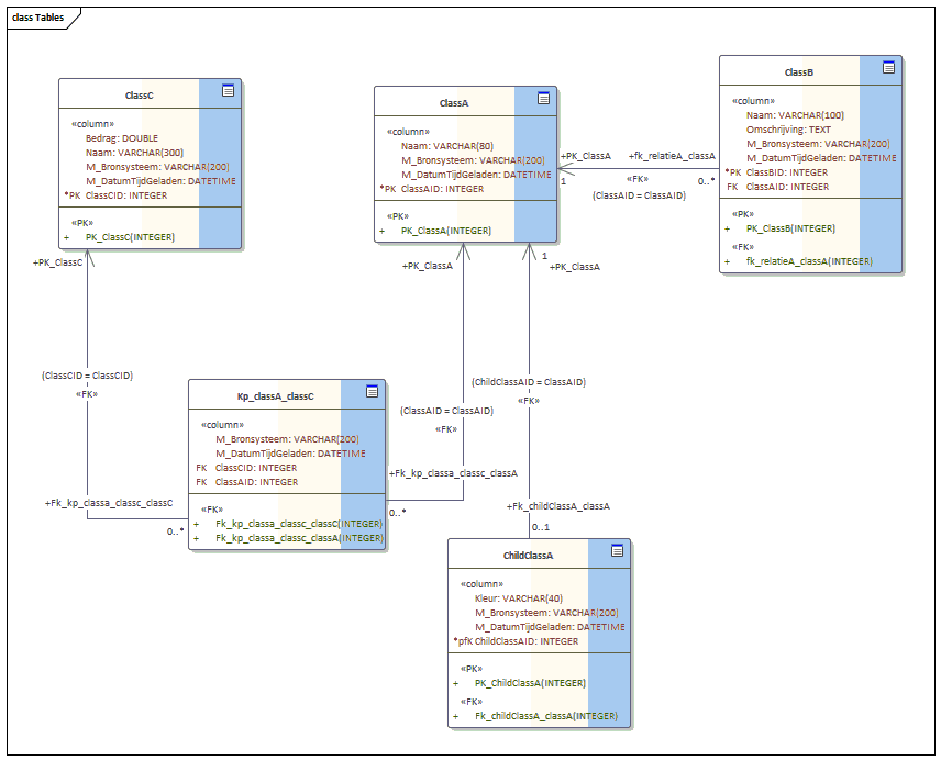 - Relatie B: de koppeltabel KP_classa_classc, met foreignkey-relaties naar tabel ClassA en tabel ClassB