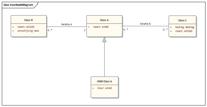 - Generalisatie van Class A t.o.v. Child Class A: dit blijven twee aparte tabellen, kolommen worden niet overgenomen in het child. Er wordt een reguliere 1:N-relatie gemaakt, zoals Relatie A.