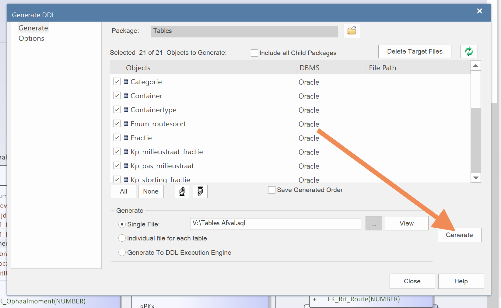 7. In de volgende stap genereer je vanuit de "logische" en RDBMS-onafhankelijke versie van de tabellen de DDL waarmee je de tabellen in je database kunt maken. Selecteer de map met de tabellen die zojuist is gegenereerd.