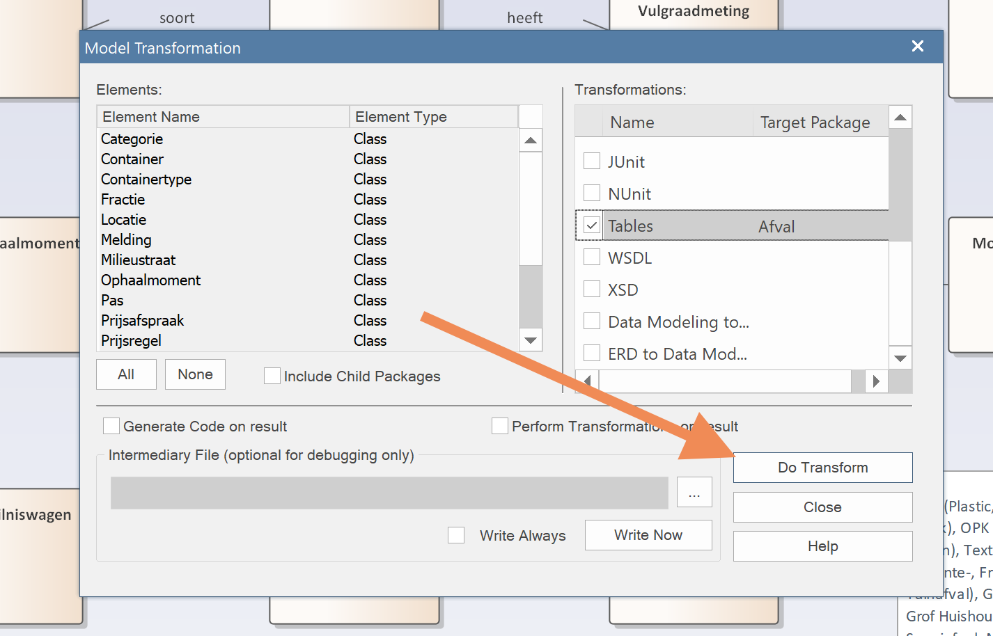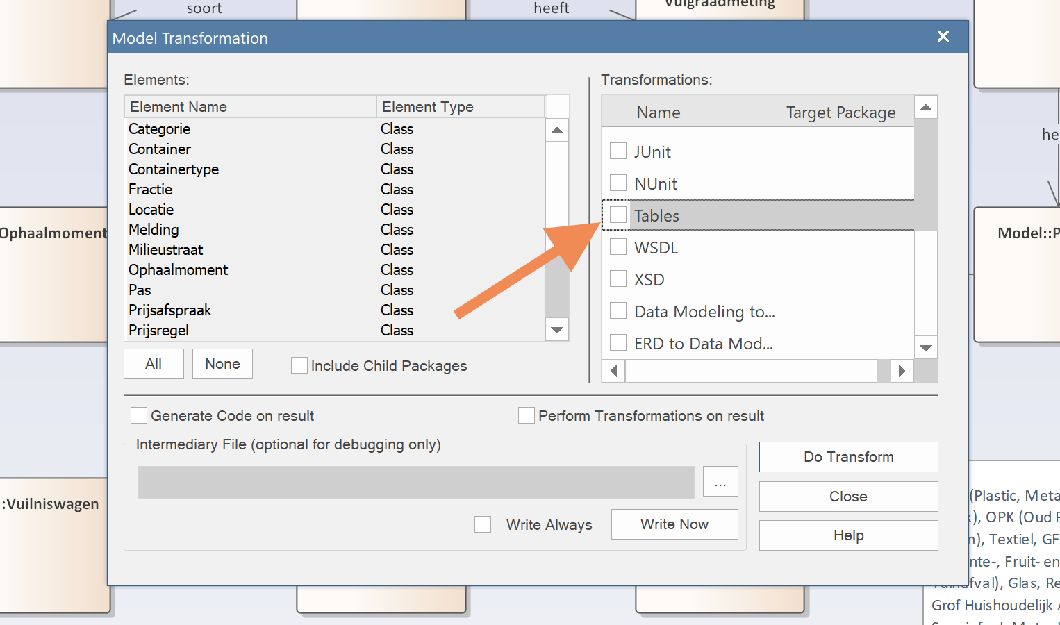 3. Selecteer aan de rechterkant van het popup Tables in het vlak Transformations. Zorg dat aan de linkerkant van de pop-up alle objecttypen geselecteerd zijn die uitgegenereerd moeten worden.