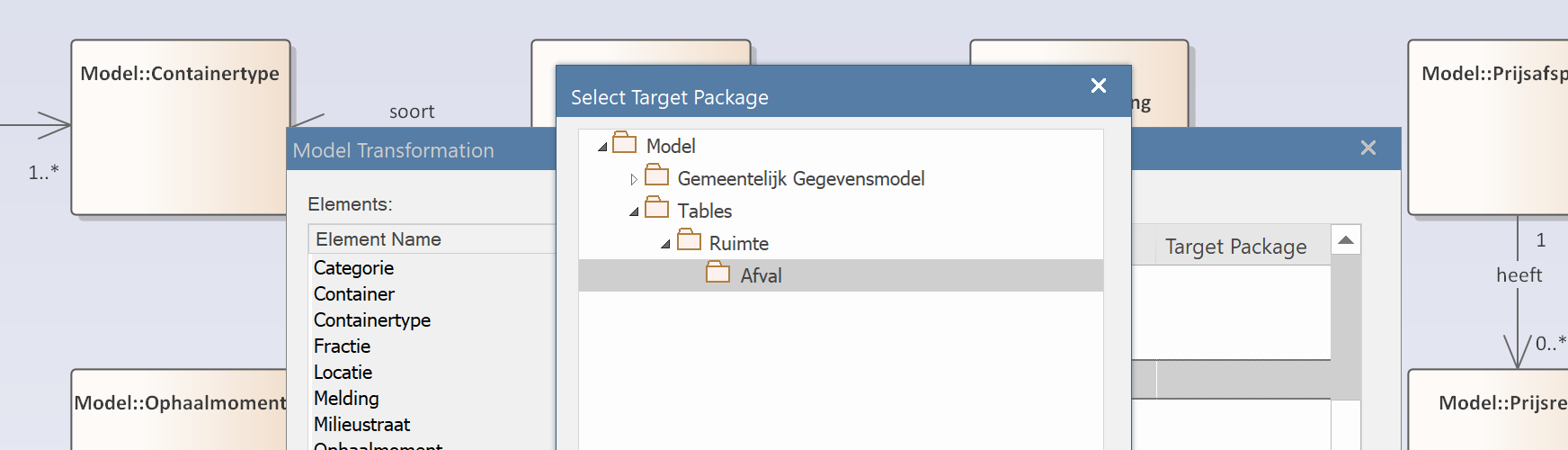 4. In het nieuwe popup Select Target Package selecteer de plek die je hebt gemaakt om de tabellen heen te schrijven. In ons voorbeeld <<DataModel>> Tables/Ruimte/Afval.