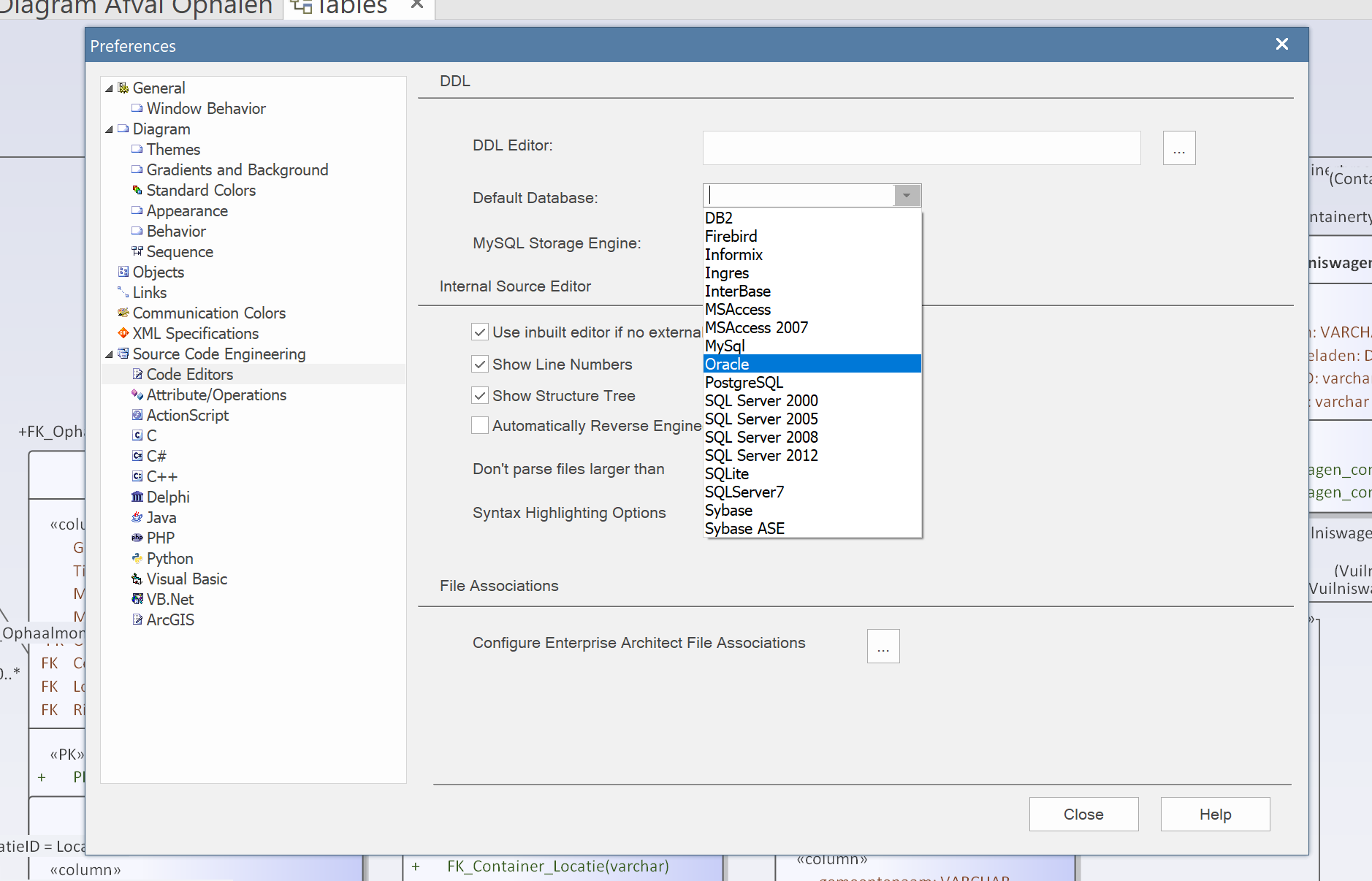 Kies vervolgens onder Source Code Engineering/Code Editors de optie Default Database. In ons voorbeeld Oracle.
