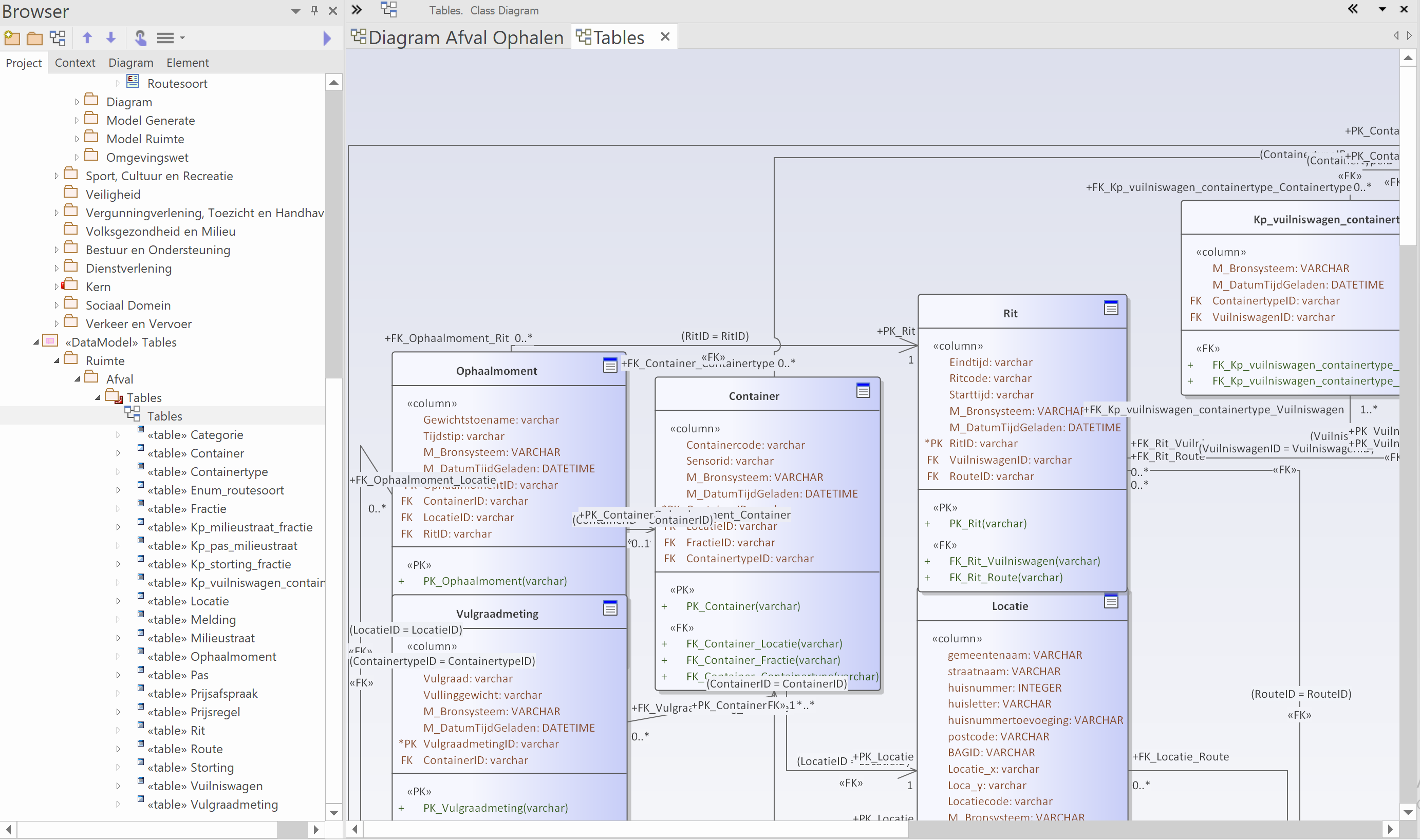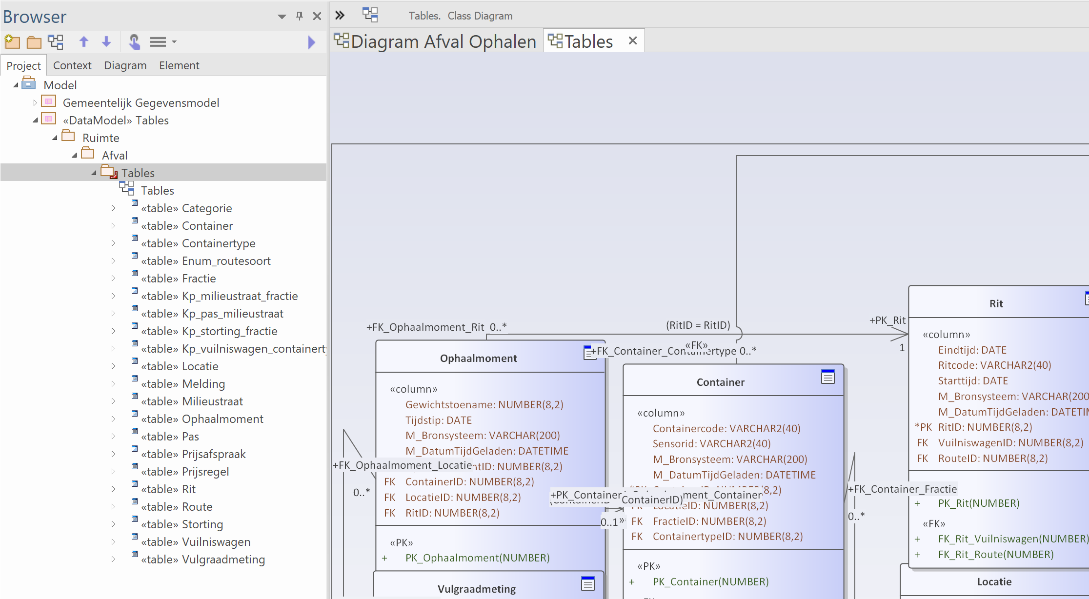 Zorg allereerst dat er in je project naast het GGM ook een plek is waar je de tabellen heen kunt schrijven. Hiervoor gebruiken wij een aparte node naast de root node. In het voorbeeld is dat de map <<DataModel>> Tables/Ruimte/Afval.
