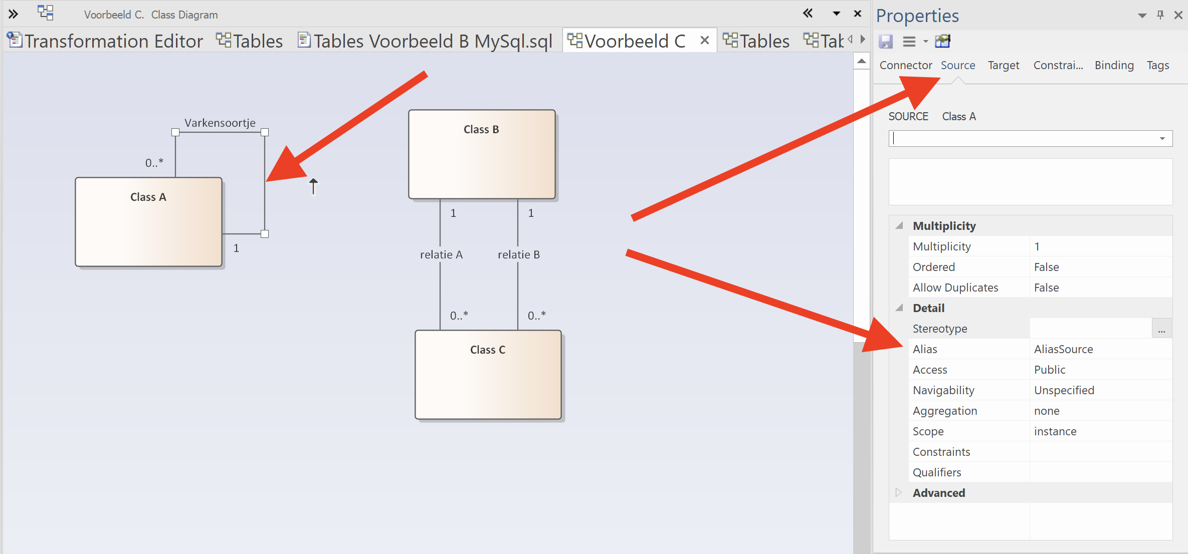 Om deze in het transformatieproces goed te laten werken moet een een Alias opvoeren bij de Source van de betreffende relatie. In het voorbeeld getoond voor het varkensoortje. Deze kun je ook voor meervoudige relaties gebruiken. Vanwege de interne werking van Enterprise Architect is het belangrijk dat de cardinaliteit 0..1 of 1 aan de source-kant van de relatie zit, anders wordt de relatie niet goed uitgegenereerd.