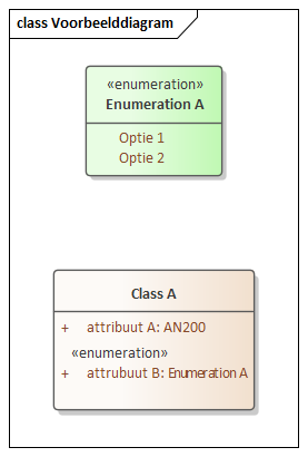Te zien is dat deze enumeratie twee mogelijke waarden kent: Optie 1 en Optie 2, en dat het attribuut B verwijst naar deze enumeratie.