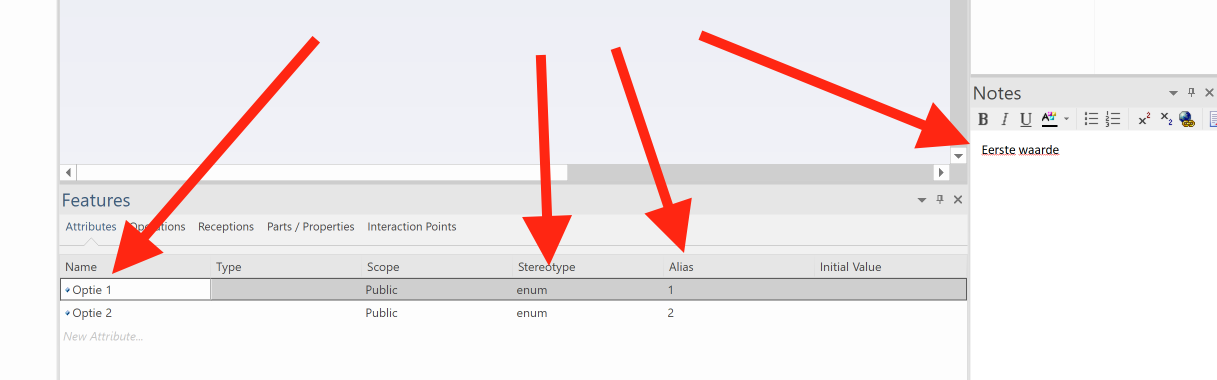 In bovenstaande figuur is te zien hoe je imn Enterprise Architect de waardelijsten van een enumeratie definieert. In het voorbeeld bestaat de waardelijst uit twee waarden: Optie 1 en Optie 2. Deze zijn als attributen van de Class 'Enumeration A' gedefinieerd. Je vult deze als volgt in: