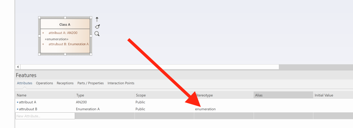 Hierboven is te zien hoe je een attribuut koppelt aan een enumeratie. Belangrijk is het stereotype de waarde "enumeration" te geven.