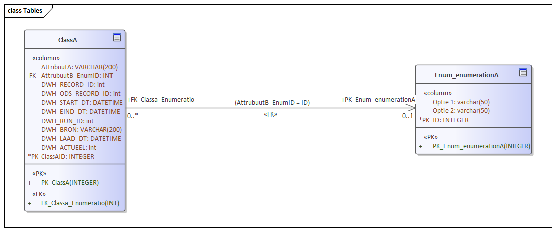Als je het logisch model hebt getransformeerd naar tabellen zie je dat er van de Class een tabel ie gemaakt, en ook van de enumeratie. Beiden zijn gekoppeld via een foreignkey constraint.