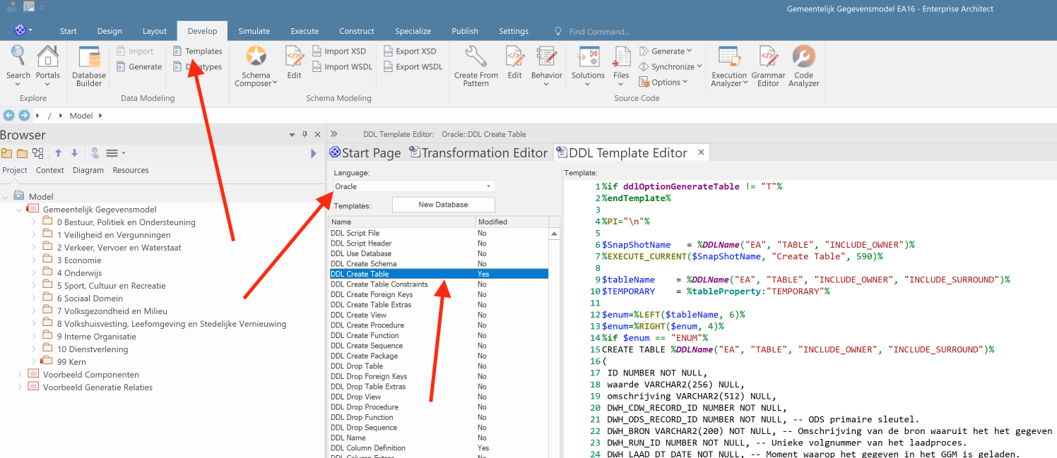 Als je zelf met Enterprise Architect DDL wilt genereren dan is bij het GGM is een set codegeneratietemplates die binnen Enterprise Architect gebruikt kunnen worden voor het genereren van Data Definition Language (DDL). Hiermee kunnen direct tabellen in een RDMBS gegenereerd worden. Er zijn diverse templates beschikbaar waarmee tabellen voor databases gegeneerd kunnen worden, en ook programmacode voor bijvoorbeeld: Python, C# en Java. In principe werkt codegeneratie voor alle ondersteunde RDBMS'en, op wat specifieke zaken na zoals enumeraties. Deze hebben wij wel ontwikkeld voor: